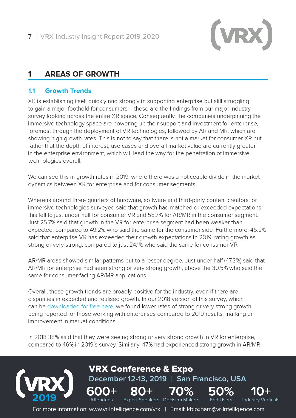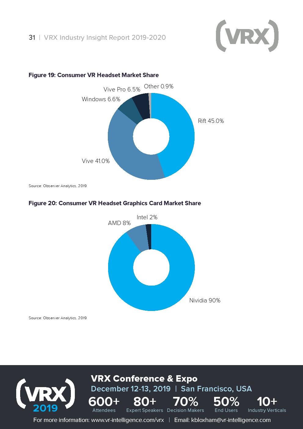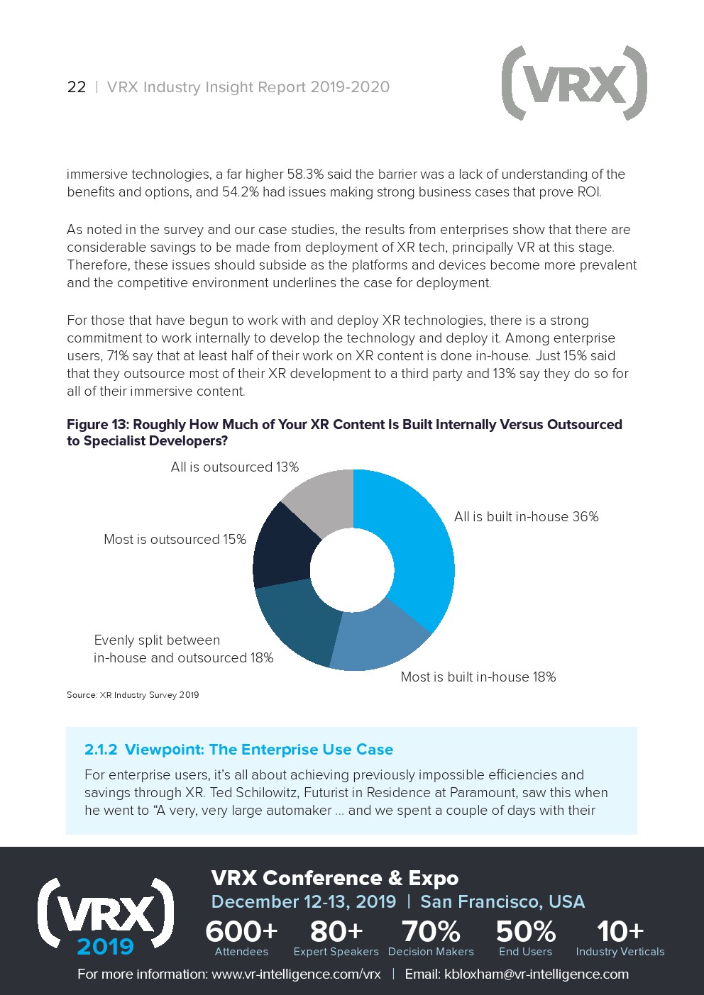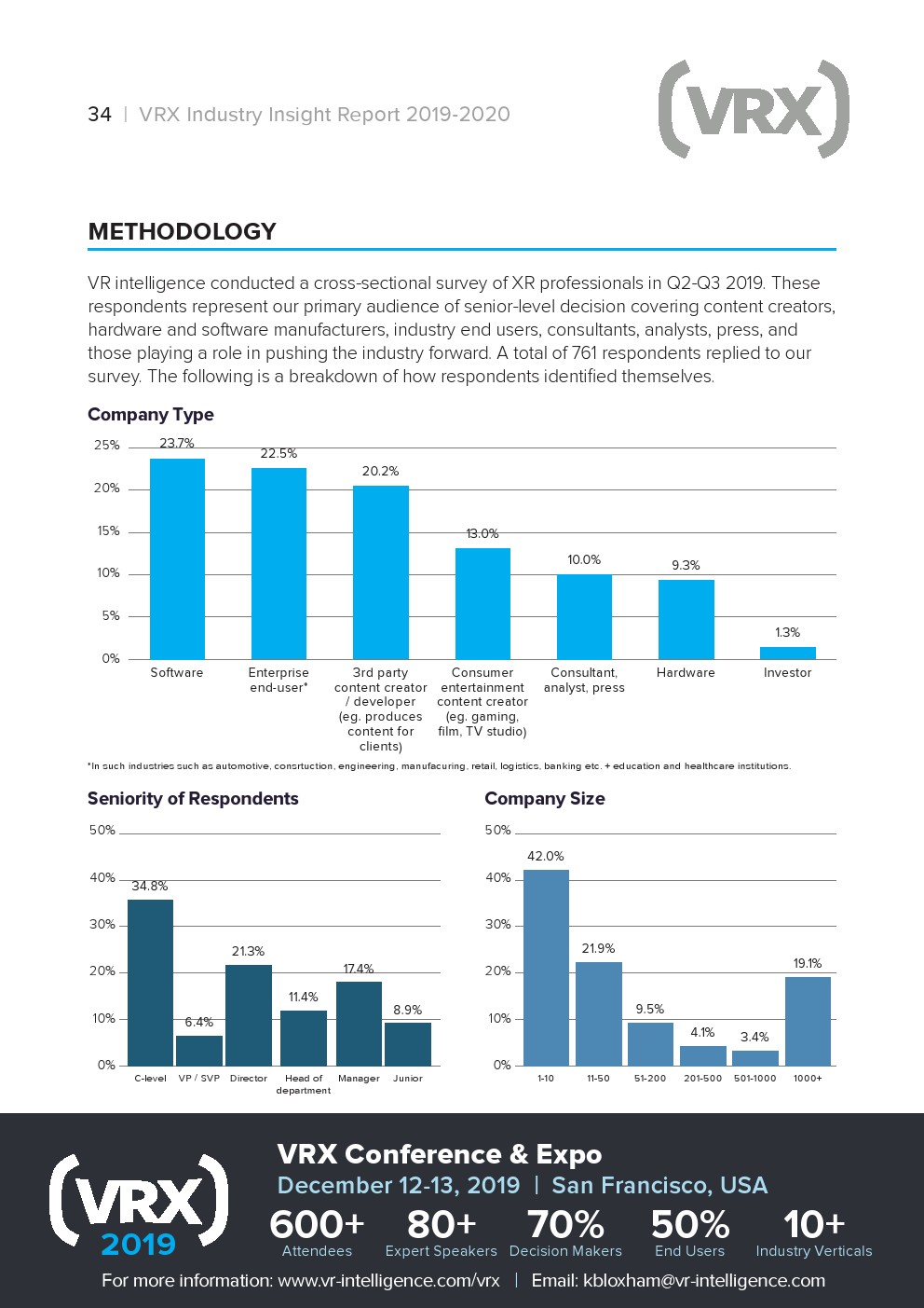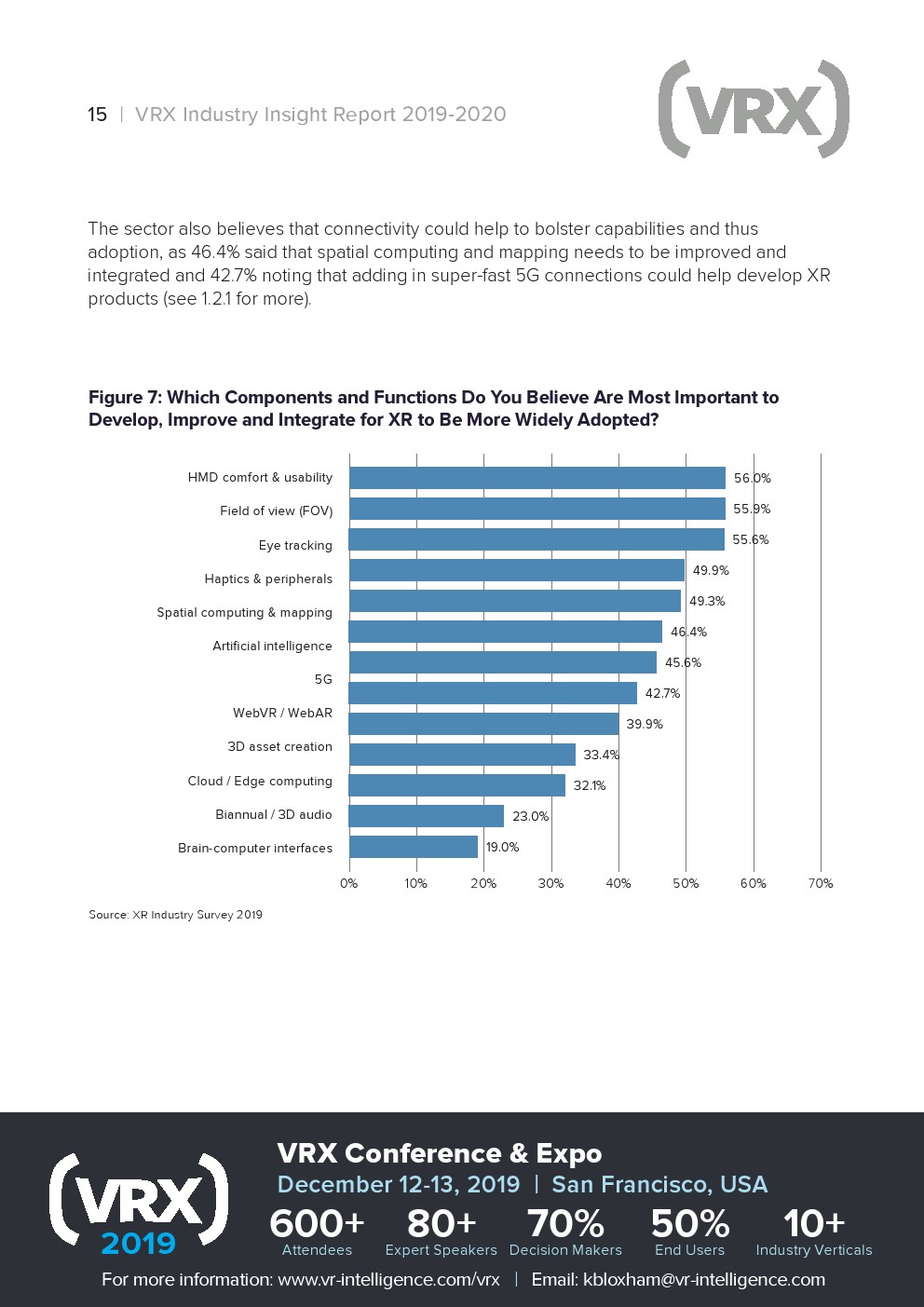 Alex Hadwick发布了“2019-2020 XR产业报告”。过去12个月,企业级XR硬件、软件和第三方内容创作增长远远高于消费者市场。只有25.7%的受访者表示,企业级VR增长比预期的要弱,对消费者市场有同样看法的占49.2%。