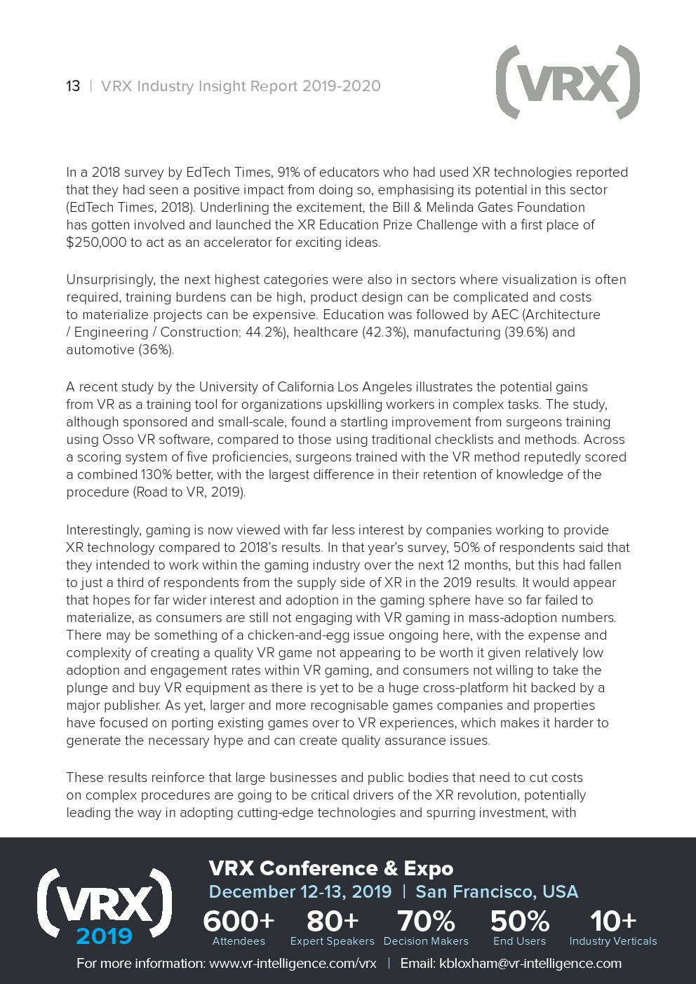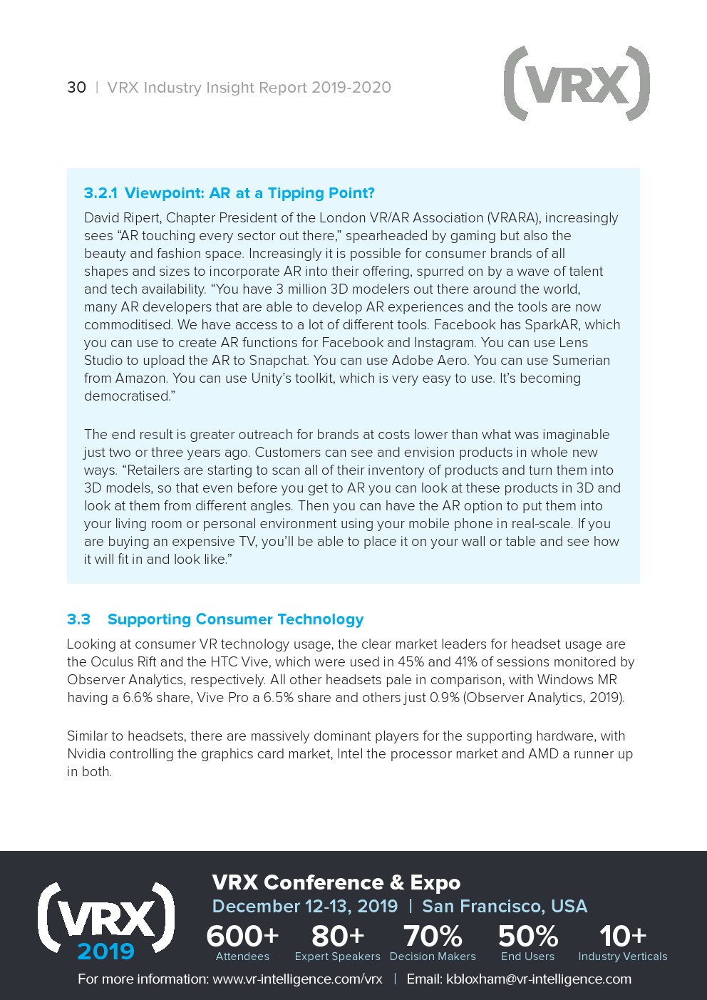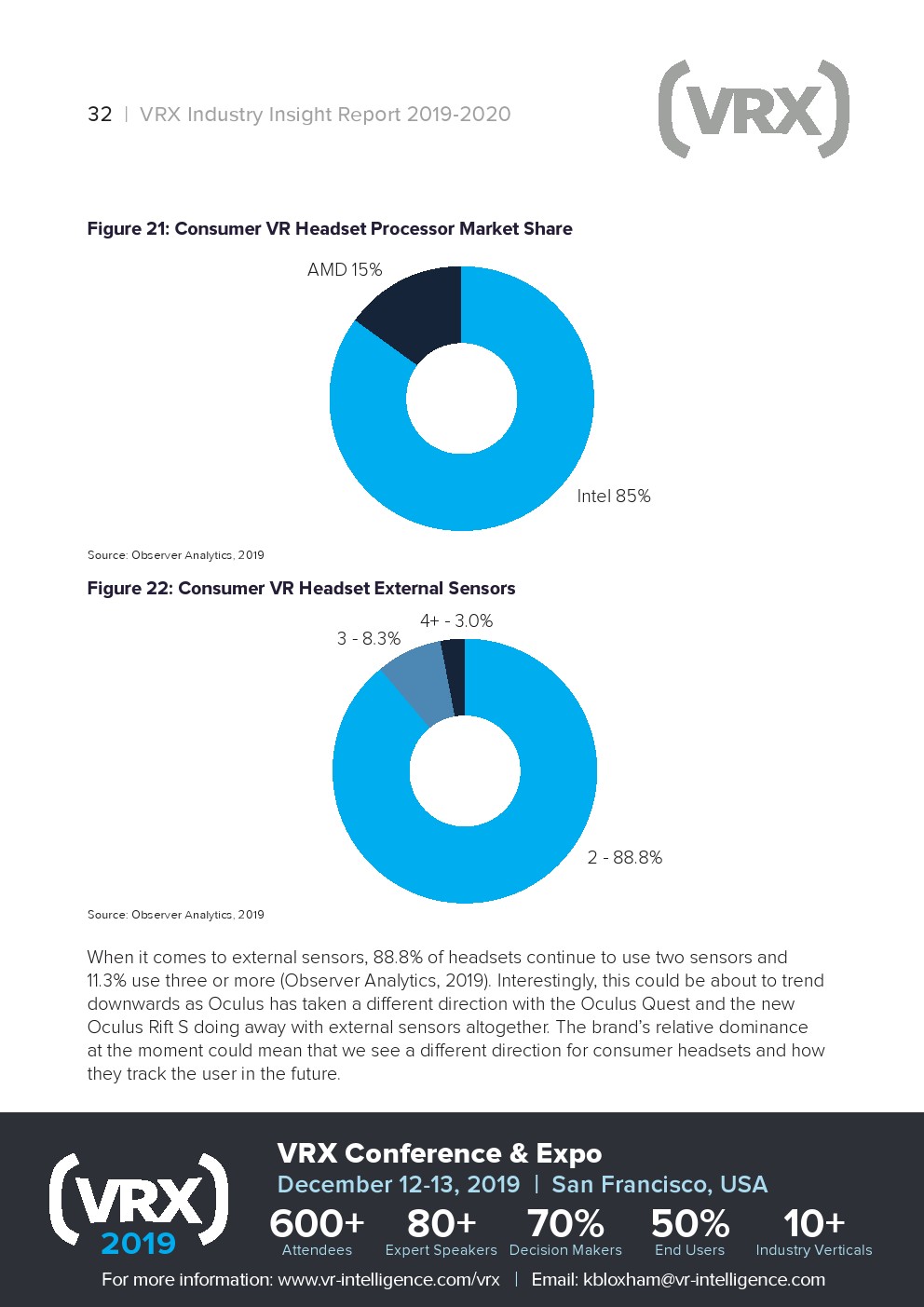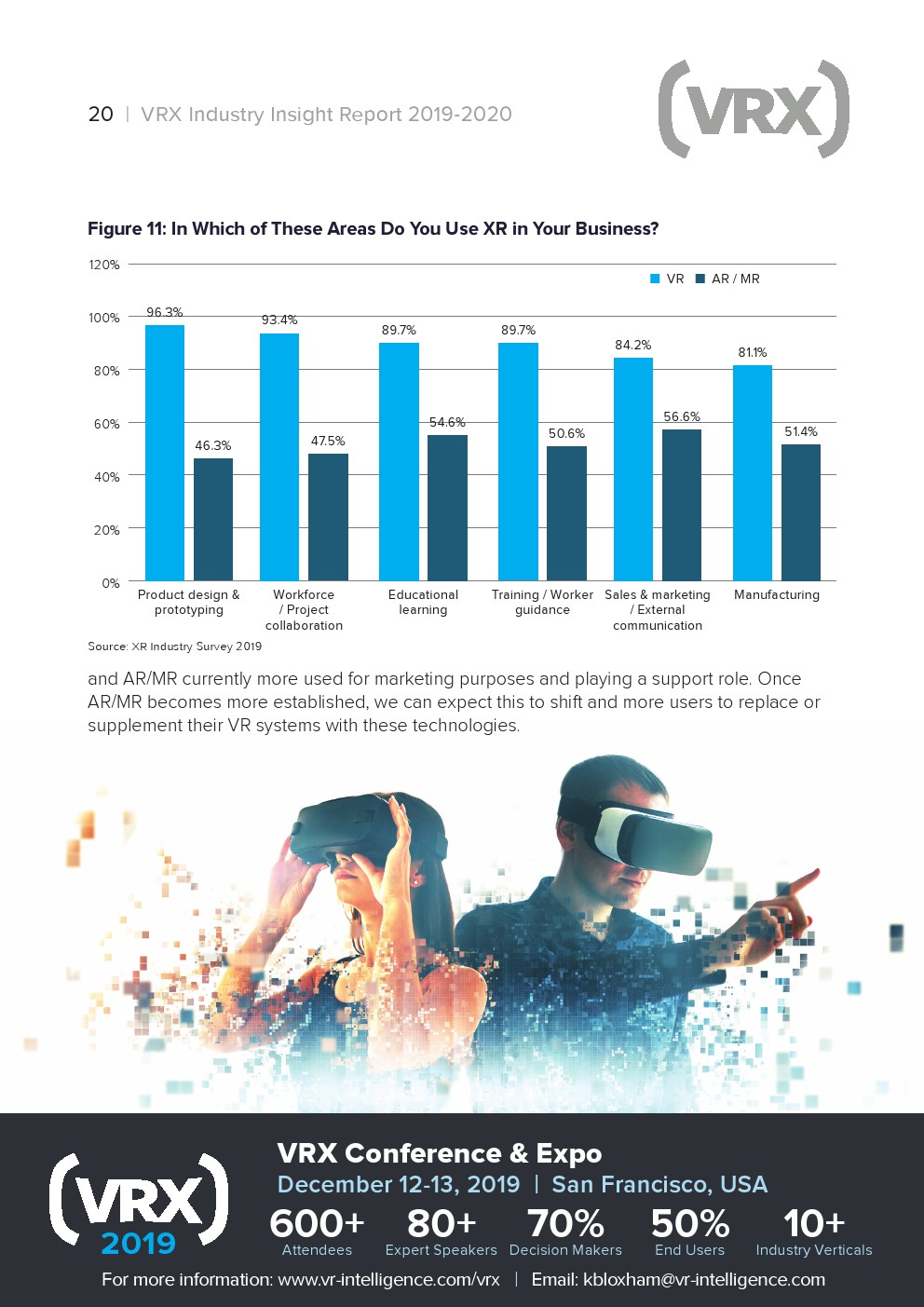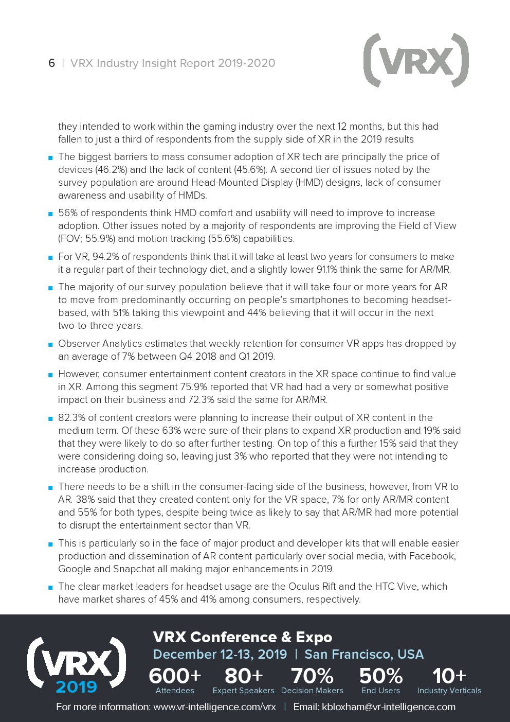 Alex Hadwick发布了“2019-2020 XR产业报告”。过去12个月,企业级XR硬件、软件和第三方内容创作增长远远高于消费者市场。只有25.7%的受访者表示,企业级VR增长比预期的要弱,对消费者市场有同样看法的占49.2%。