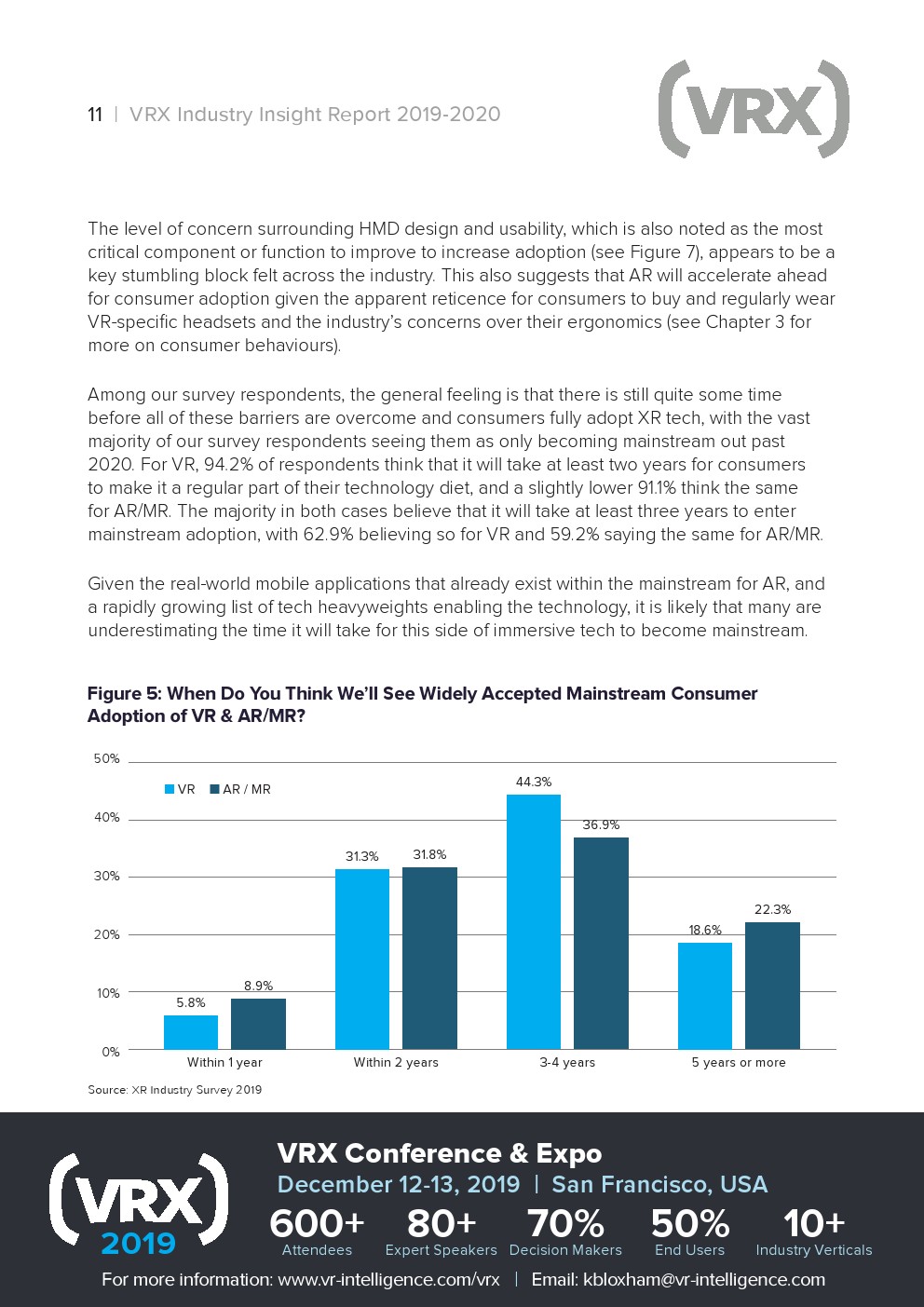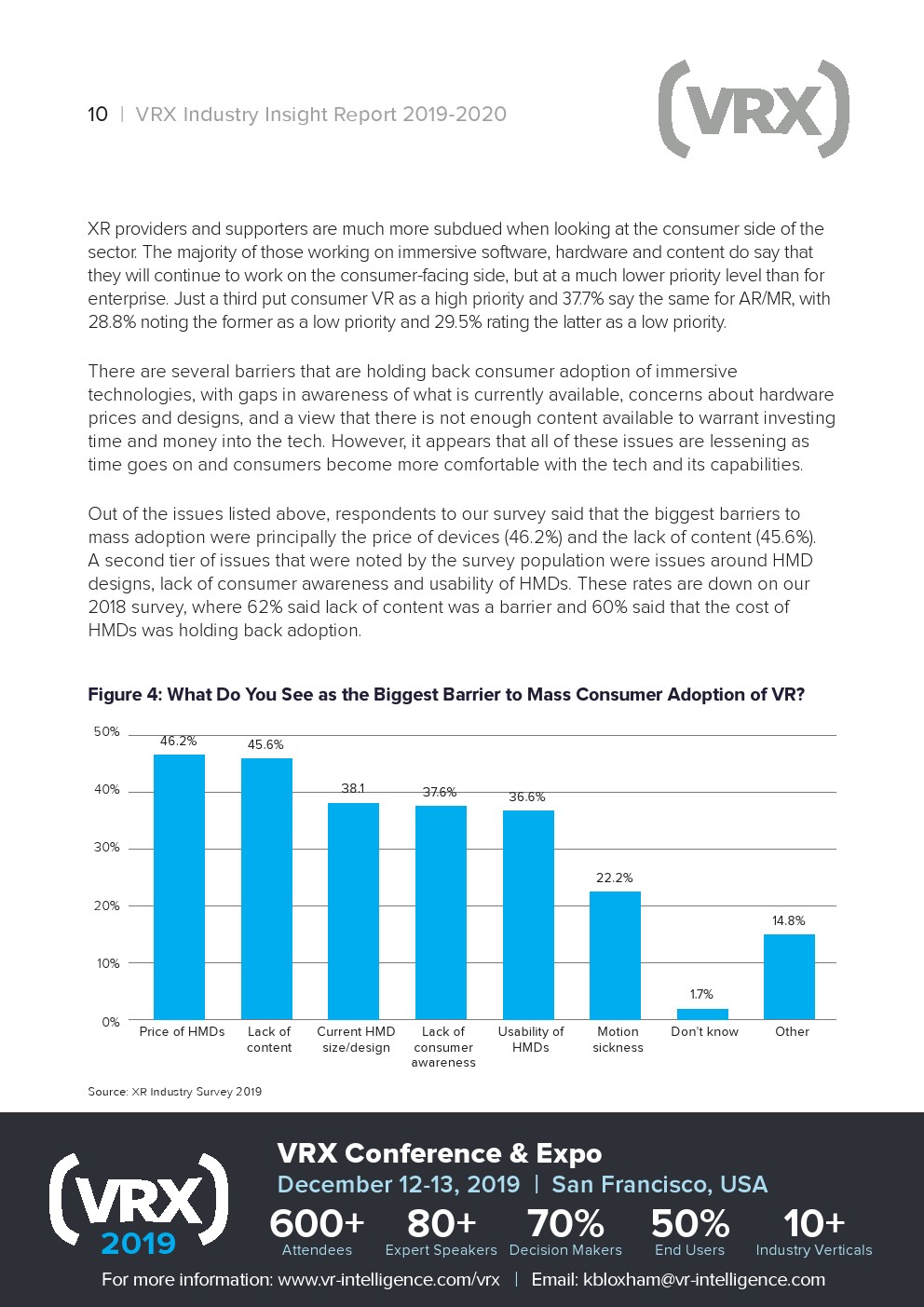 大众消费者采用XR技术的最大障碍是设备的价格 (46.2%)和缺少内容(45.6%)。