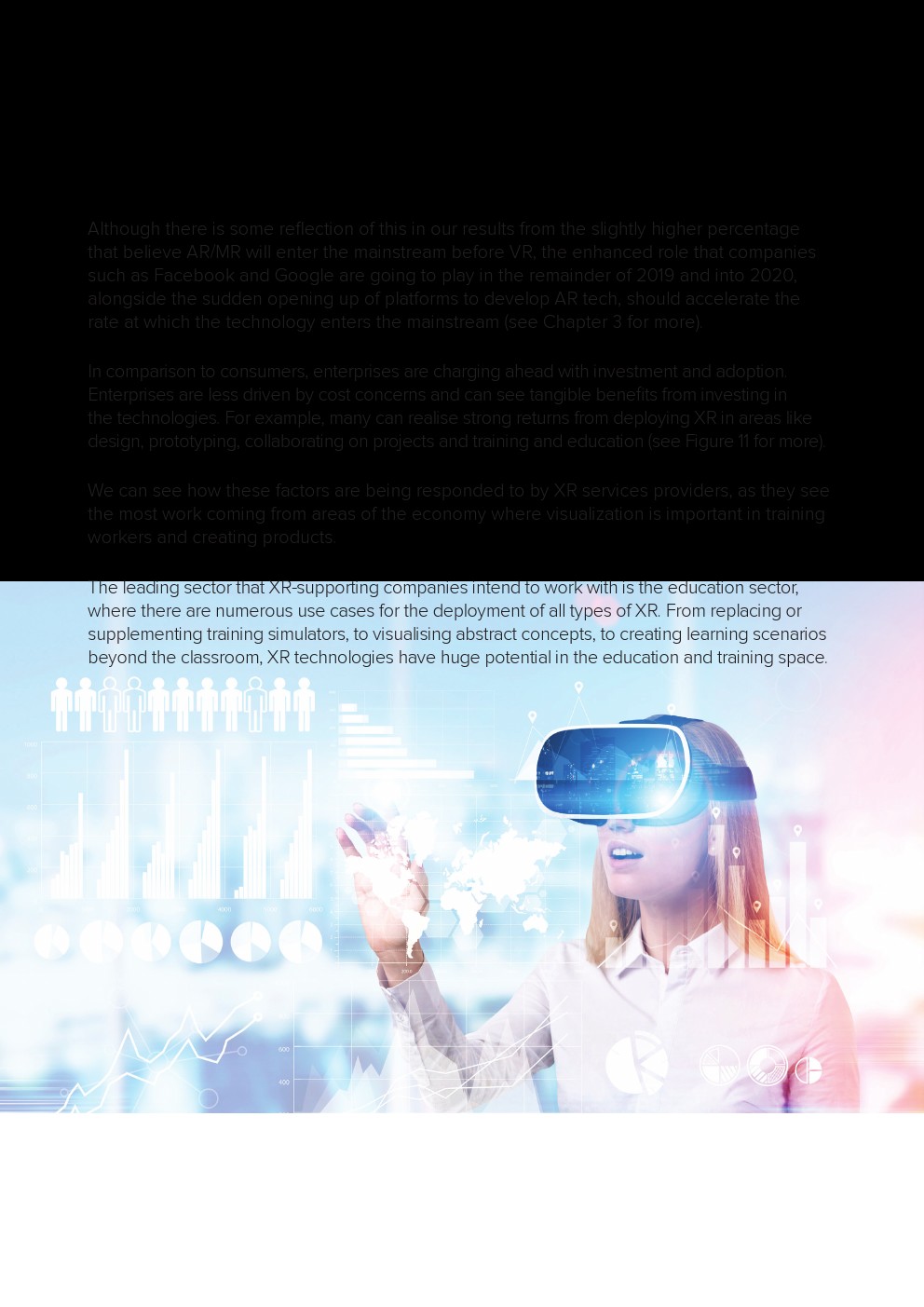 73%的XR技术公司和内容供应商正在为企业功能开发VR;约65%的公司在开发AR和MR。不到一半的公司正在为消费者市场开发VR,只有37.4%的公司正在开发消费者AR和MR应用。