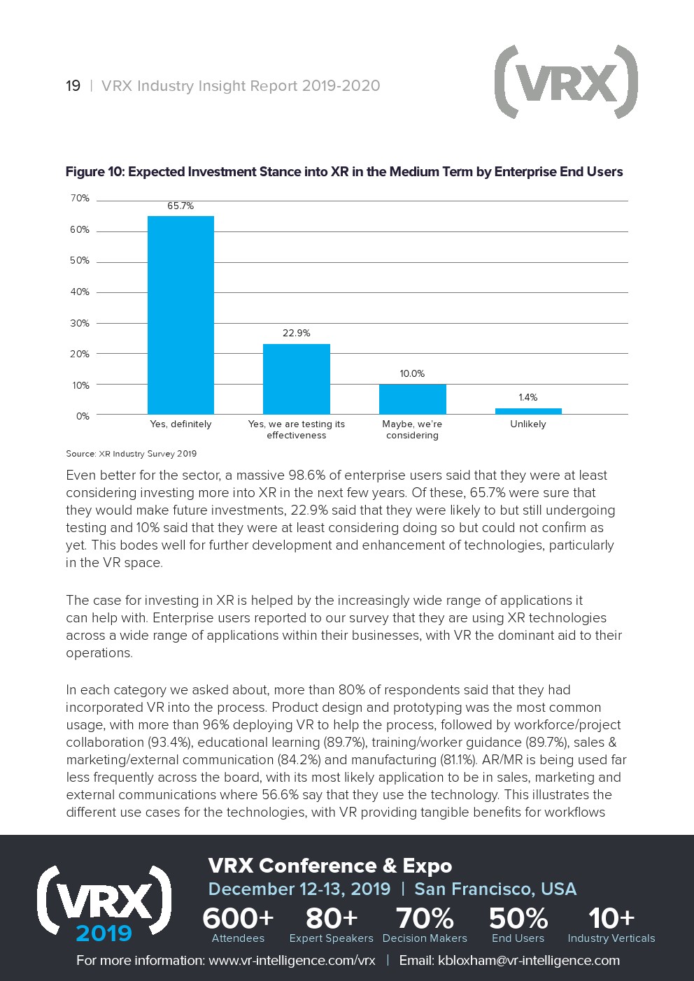 98.6%的企业用户考虑未来几年对XR进行更多的投资;65.7%的企业用户确信他们未来会投资XR;22.9%的企业用户可能会这样做,但仍在进行测试;10%的企业用户至少在考虑这样做。