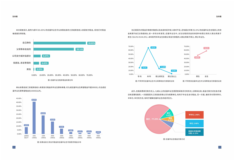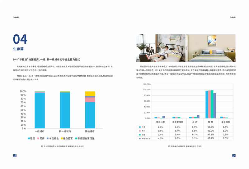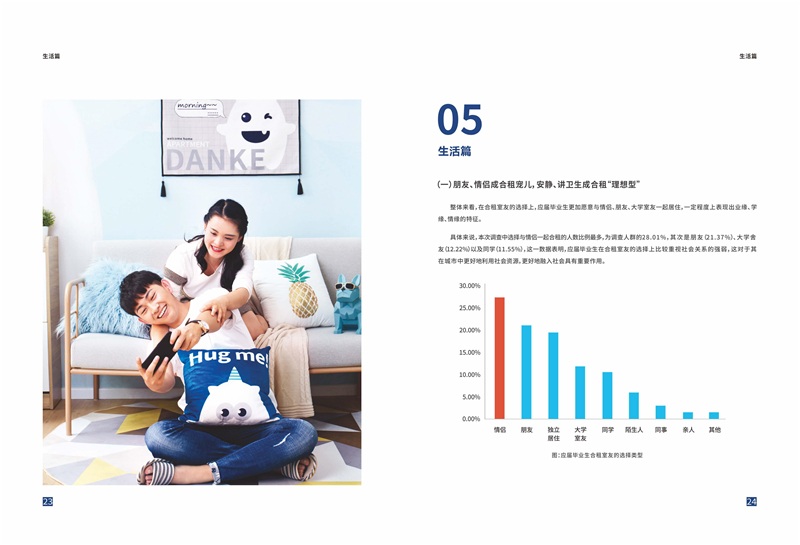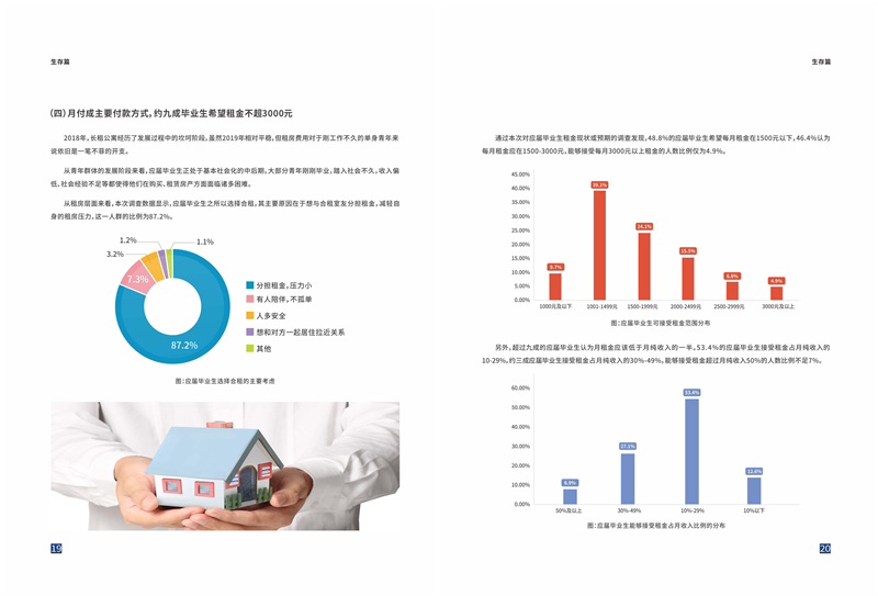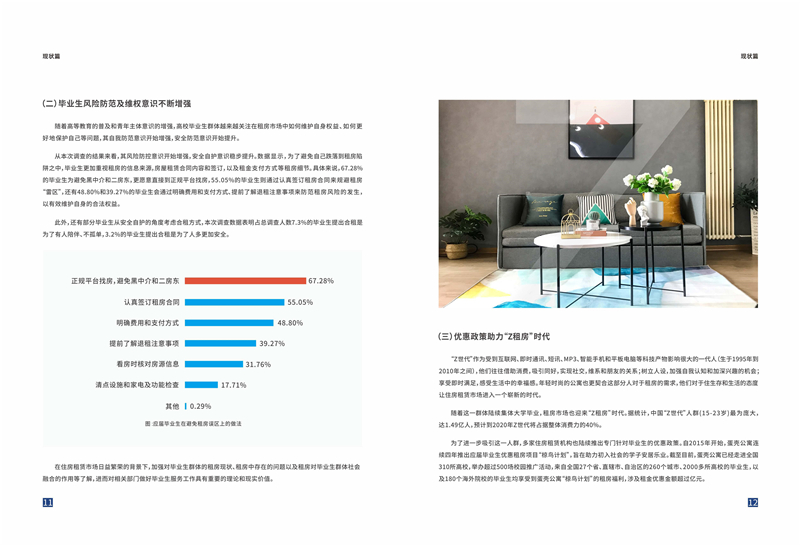 《租住蓝皮书》的数据来源于人民在线、蛋壳公寓联合未来网发起的“2019应届毕业生租住状况”调研。书中指出,毕业季成租房旺季,合租、月付是应届毕业生租房主要选择。65.83%的应届毕业生依靠自身支付租金,对租金敏感度较强。约九成毕业生希望租金不超过3000元,近半毕业生租金预期不超过1500元。毕业生在租房方面的风险防范及维权意识不断增强,网络成毕业生获取租房信息的主要渠道,多数人选择正规平台找房。