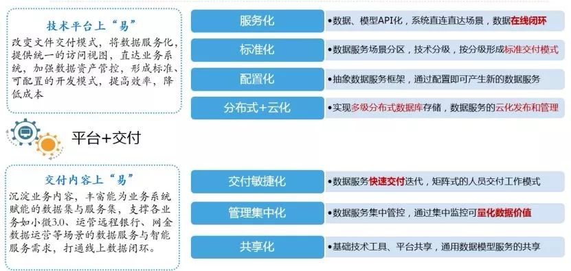 数据中台自身和业务结合紧密度高,结合现阶段金融业务经营的迫切诉求,在战略上对数据中台建设从技术平台和数据交付内容两个层面制定如下图的建设目标。