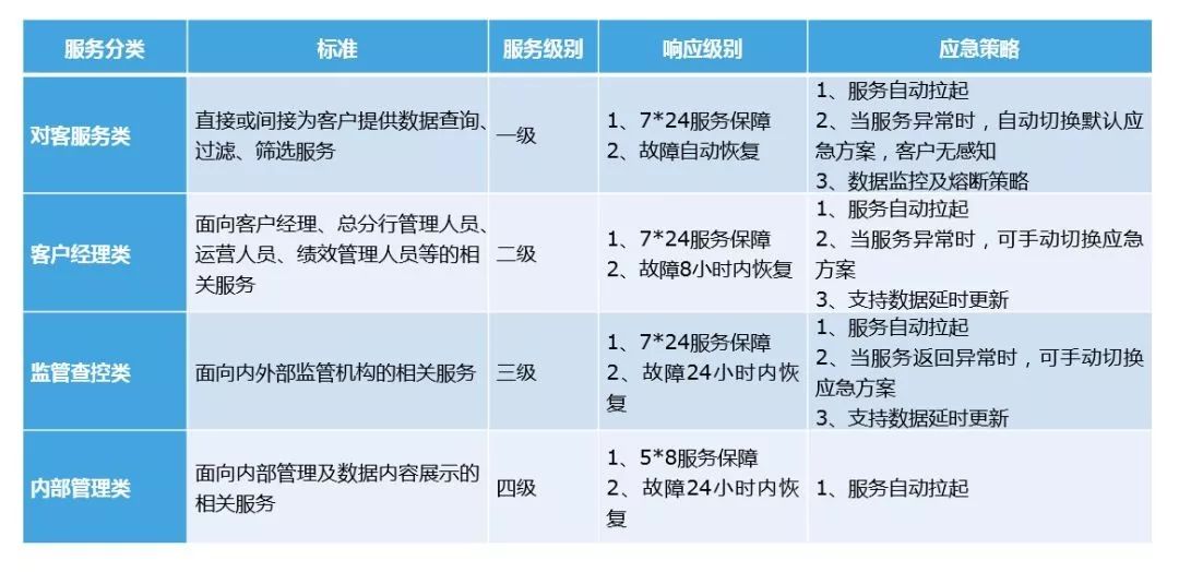 根据服务与用户触达类型对服务进行分类,包括对客服务类、客户经理类、内部管理类、监控查控类,制定不同界别的响应和应急策略。