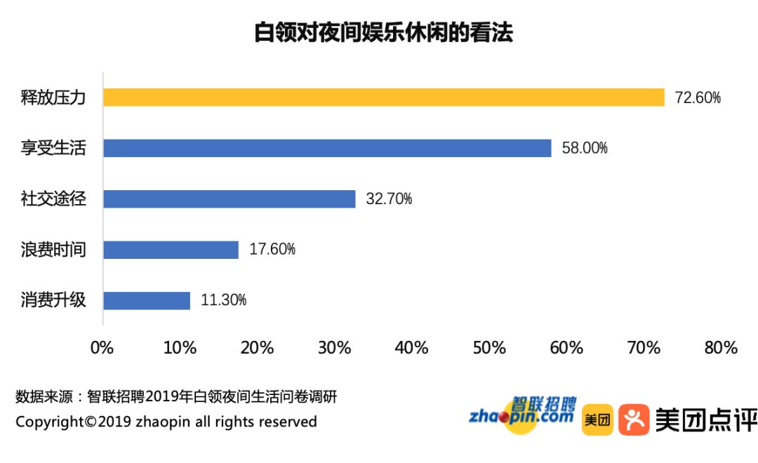 根据智联招聘《2019年中国白领夜间消费调研报告》显示,在白领对于夜间娱乐休闲的看法中,释放压力和享受生活占据重要地位,分别为72.6%和58%,其次用来社交也被大部分白领所认可,占比为32.7%。