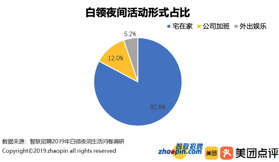 除去加班这个不可控因素外,在家与外出形成了两个极具反差的阵营, 82.8%的白领选择晚上宅在家,仅5.2%的白领习惯于夜间外出娱乐。也就是说,16个人中只有1个人在夜间会选择外出娱乐。