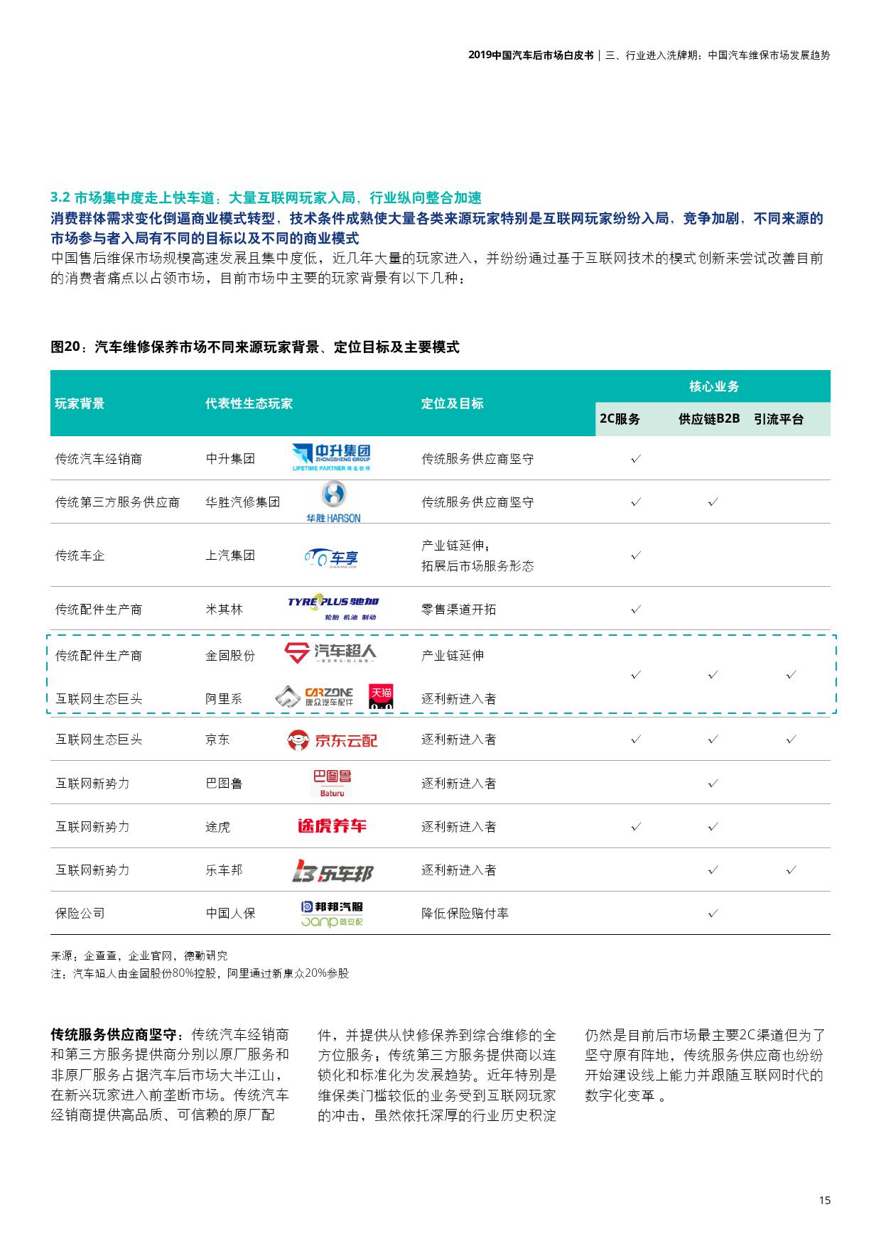 在此发展机遇下,以上汽为代表的传统车企、以金固股份为代表的配件生产商、以阿里、京东为代表的互联网巨头以及保险公司、互联网新势力等大量玩家入局,他们带来不同的商业模式,通过基于互联网技术的模式创新来尝试改善目前的消费者痛点以占领市场,促进行业纵向整合加速,推动市场集中度走上快车道。