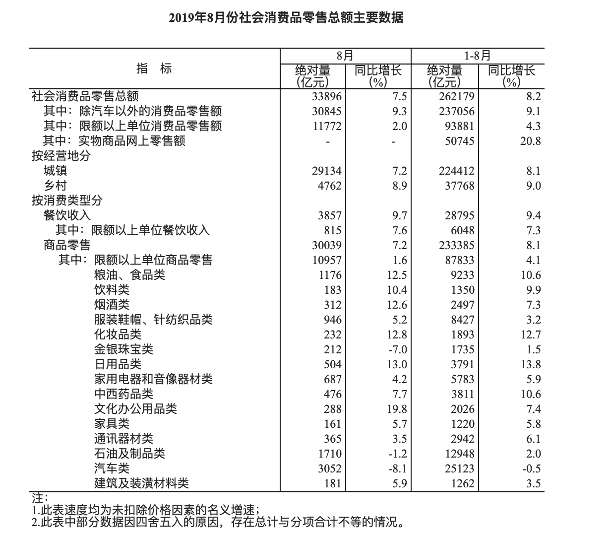 2019年8月份,社会消费品零售总额33896亿元,同比名义增长7.5%(扣除价格因素实际增长5.6%,以下除特殊说明外均为名义增长)。其中,除汽车以外的消费品零售额30845亿元,增长9.3%。