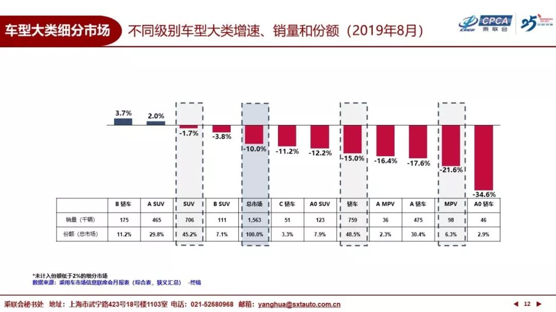 不同级别车型大类增速、销量和份额——2019年8月及累计