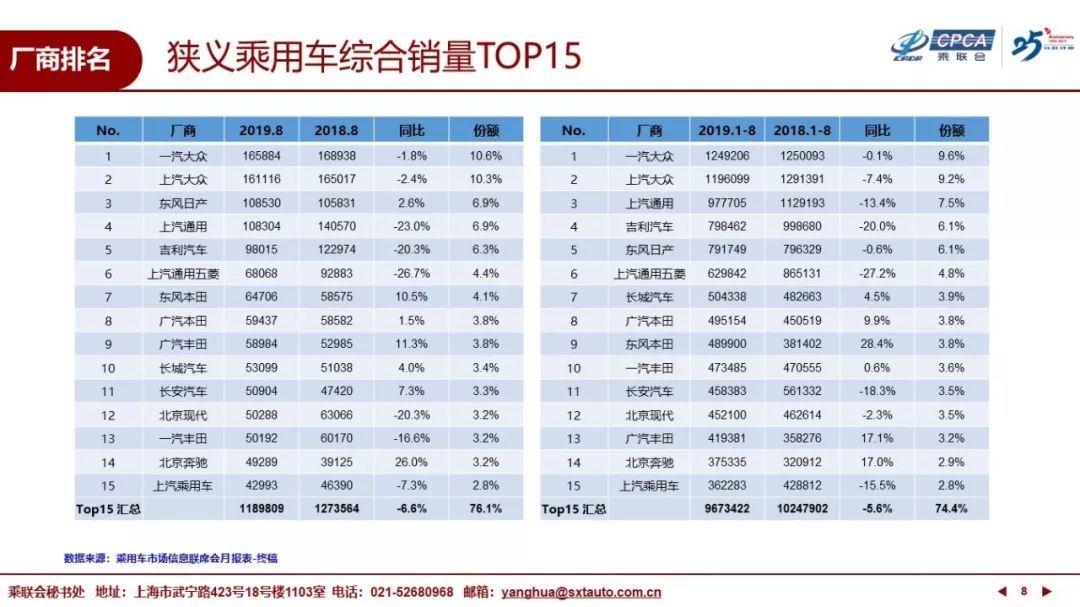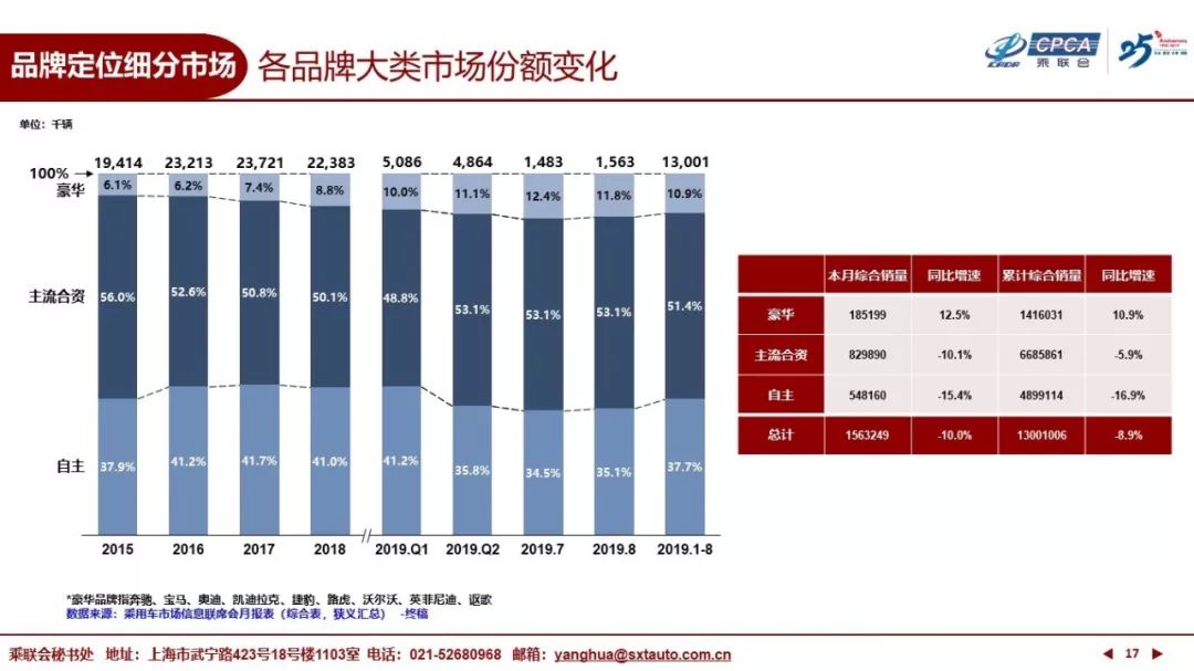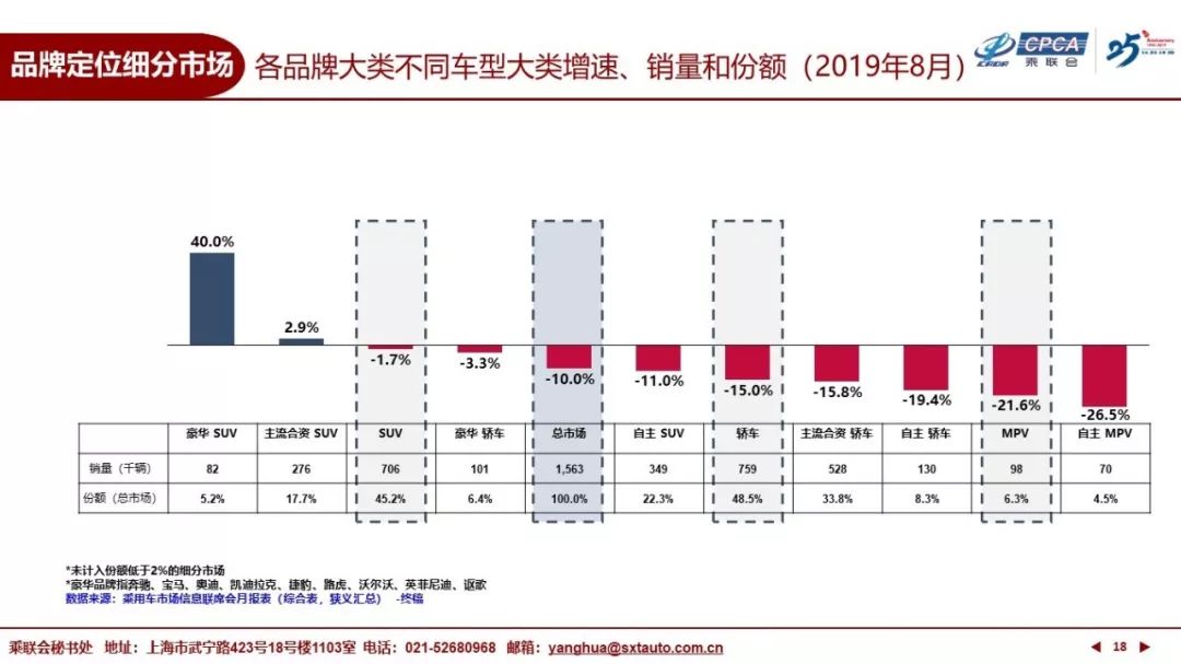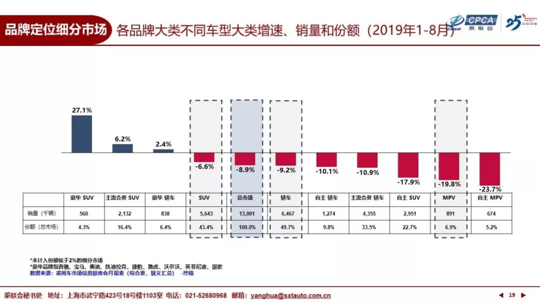 各品牌大类下不同车型大类增速、销量和份额——2019年8月及累计