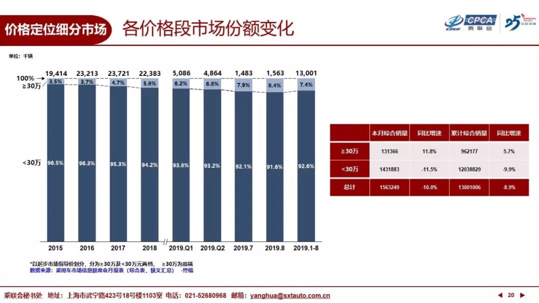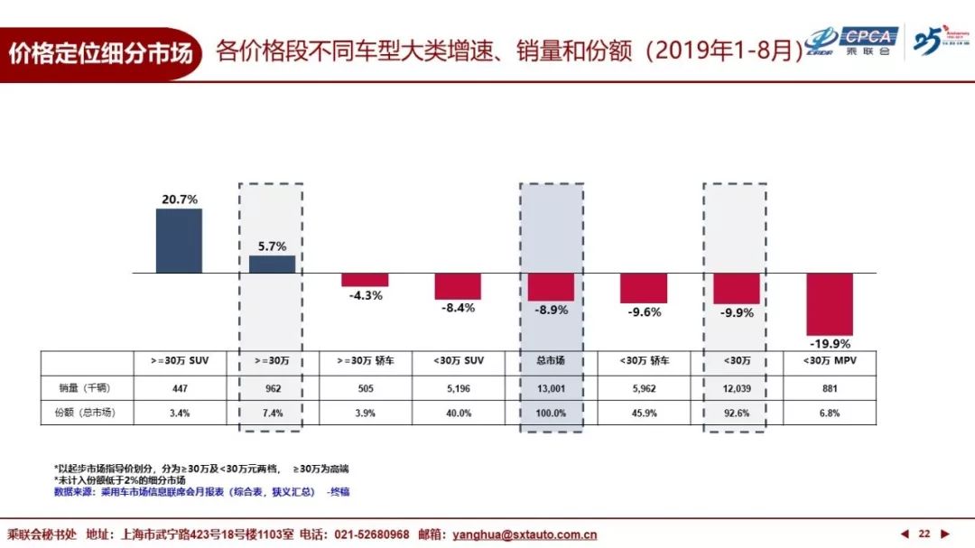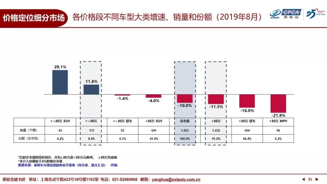 各价格段不同车型大类增速、销量和份额——2019年8月及累计