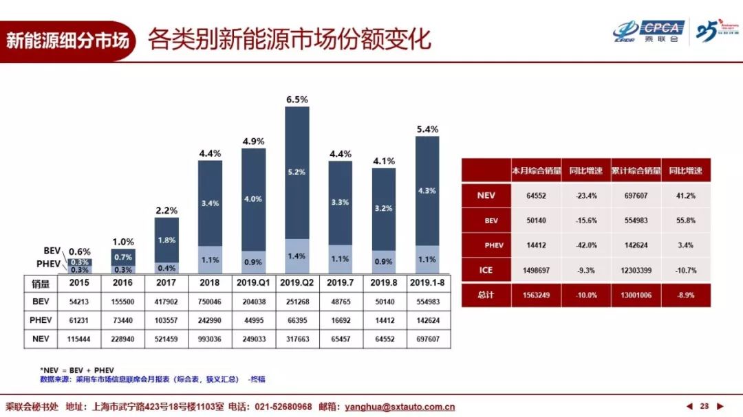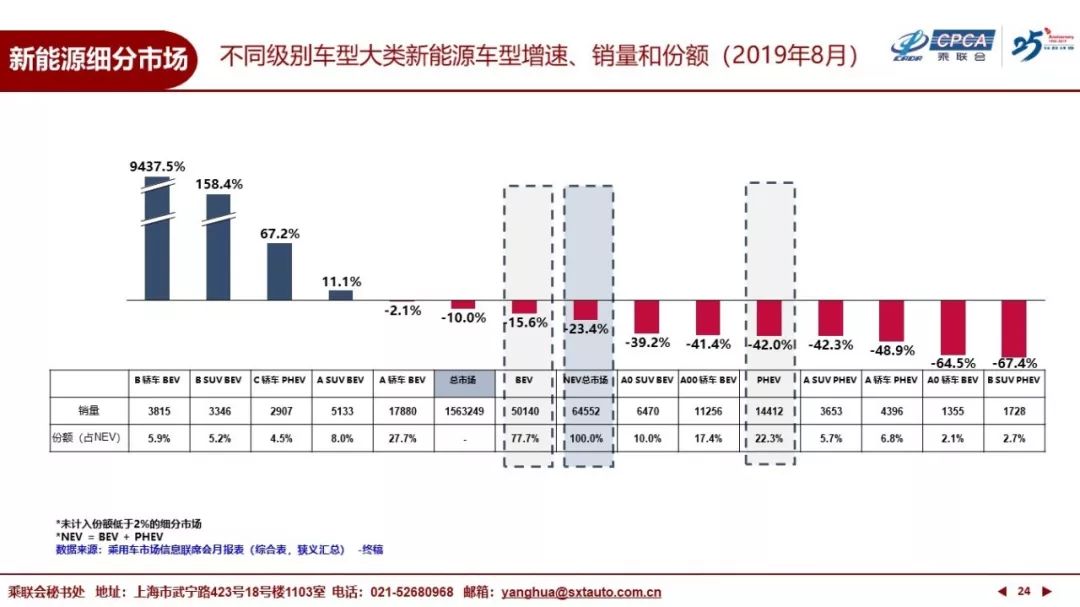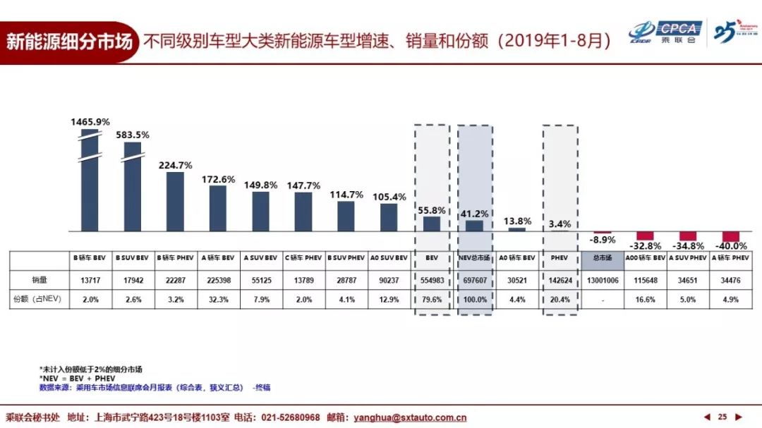 不同级别车型大类新能源车型增速、销量和份额——2019年8月及累计