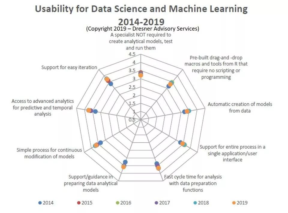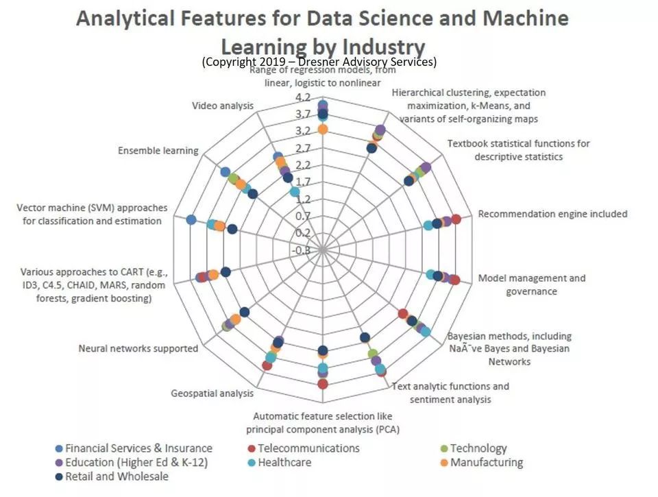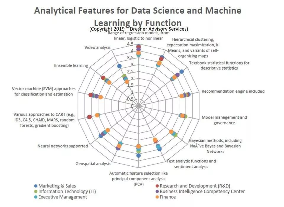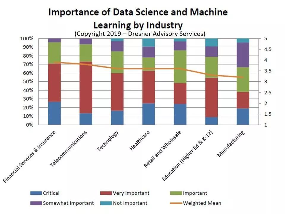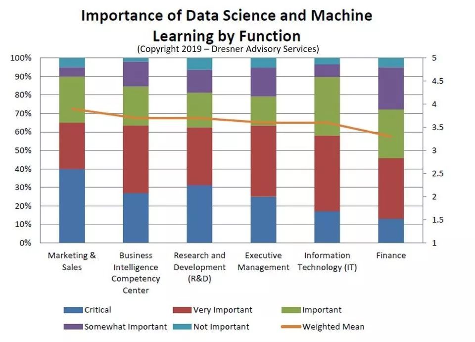 诸如此类发人深省的调查结果来自咨询服务公司Dresner Advisory Services上个月发布的第六份《2019年度数据科学和机器学习市场研究报告》。该研究报告发现,与数据科学和机器学习有关的高级项目(包括数据挖掘、高级算法和预测分析)在本研究报告调查的37项技术和项目中排名第8位。