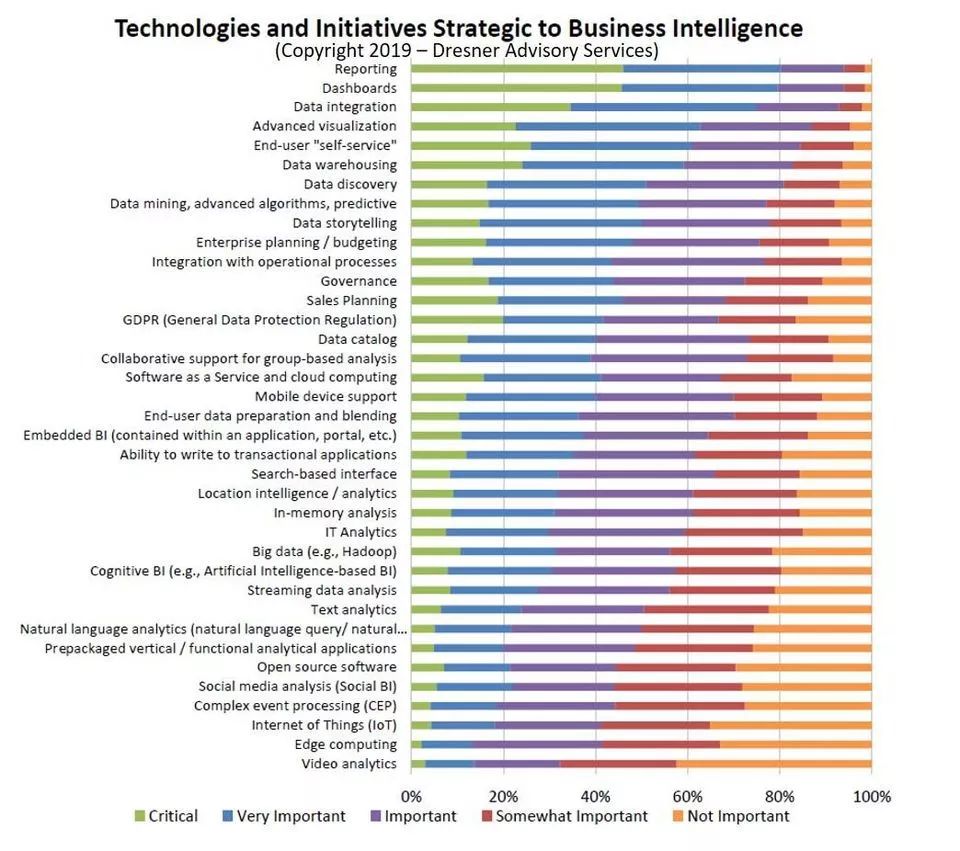 数据挖掘、高级算法和预测分析是2019年采用AI和机器学习的企业最重视的几个优先项目。报告、仪表板、数据集成和高级可视化是对如今商业智能(BI)而言具有战略意义的几大技术和项目。认知BI(基于AI的BI)在优先项目中排名较低,名列第27位。下图按优先级列出了对商业智能而言具有战略意义的27项技术和项目: