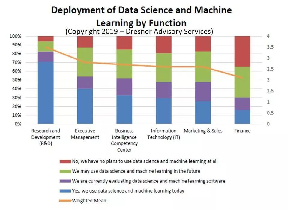 - 2019年,研发部门采用AI和机器学习的步伐是所有企业部门中最快的。