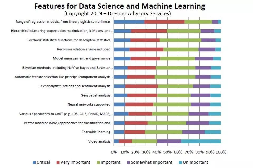 支持一系列广泛的回归模型、层次聚类和常用的教科书统计功能是企业在数据科学和机器学习平台中所需的几大功能。Dresner的研究团队发现,企业评估数据科学、AI和机器学习应用软件和平台时,这三项功能被认为最重要或“必不可少”。所有接受调查的企业还期望它们在评估的任何数据科学应用软件或平台包含推荐引擎和模型管理及治理功能。下图按优先级列出了企业期望在数据科学、AI和机器学习软件和平台中看到的最重要和最不重要的功能: