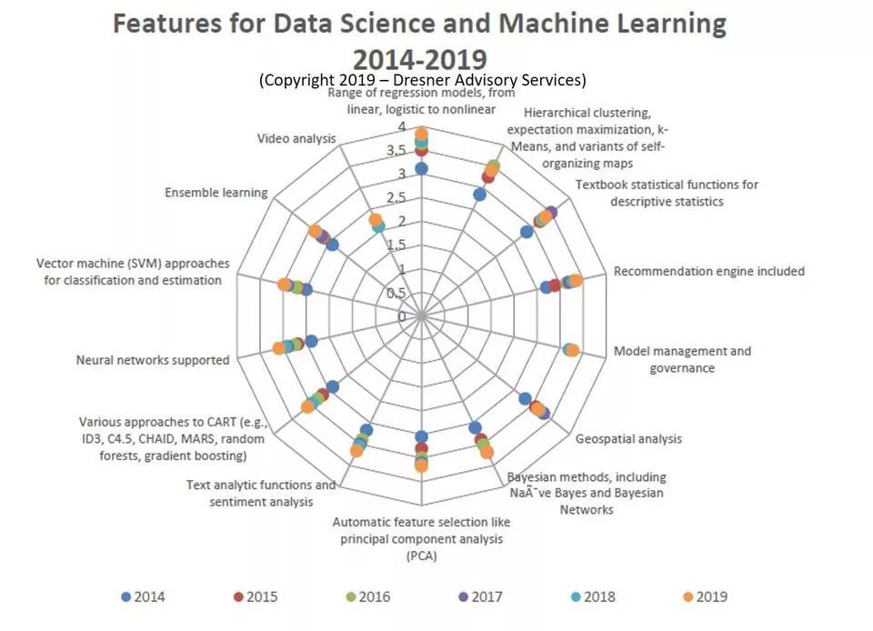 2019年是企业对数据科学、AI和机器学习功能感兴趣方面创纪录的一年,它们认为实现其业务战略和目标最需要这些功能。企业最希望AI和机器学习应用软件和平台支持一系列回归模型,其次是层次聚类和用于描述性统计的教科书统计功能。推荐引擎越来越受欢迎,因为这方面的兴趣已有所加大,至少成为2019年受访者眼里的并列第二重要的功能。与2018年相比,地理空间分析和贝叶斯方法的重要性持平或略有所降低。下图比较了六年来企业对数据科学、AI和机器学习技术的兴趣: