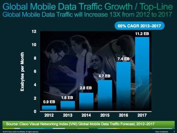 从现在到2017年,全球移动数据流量将以66%的平均年增长率递增;届时全球移动数据总流量将达到134EB,大约是2010年的移动数据总流量的46倍。