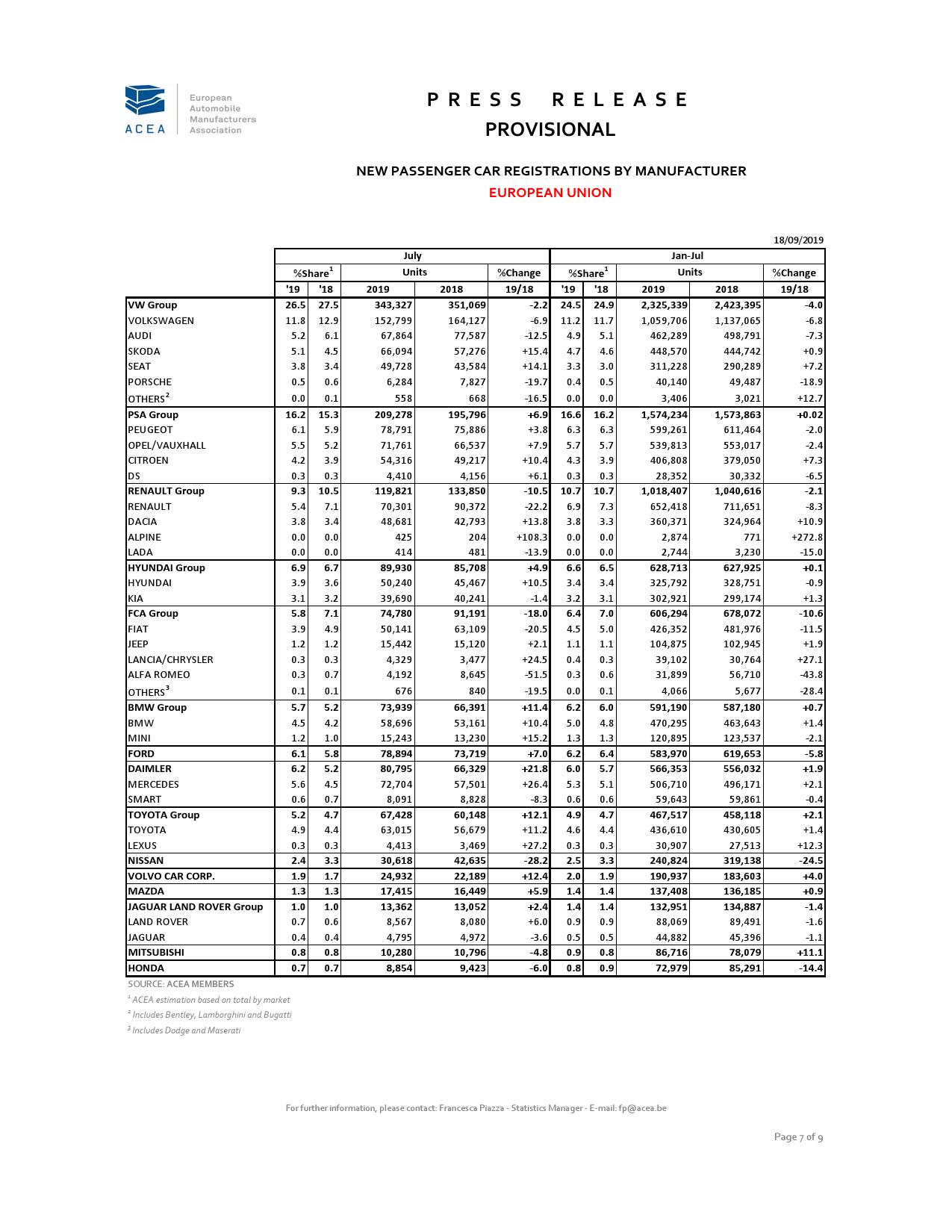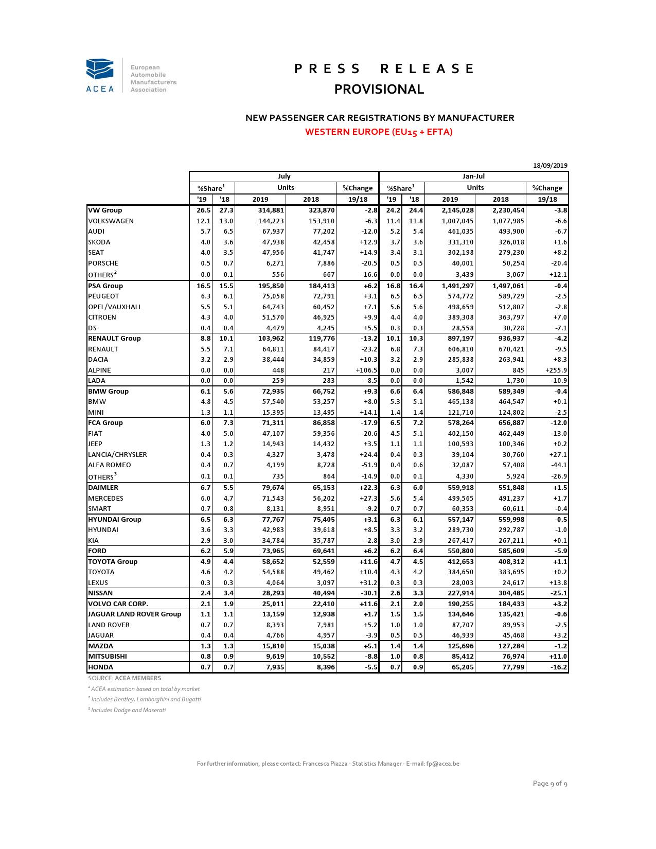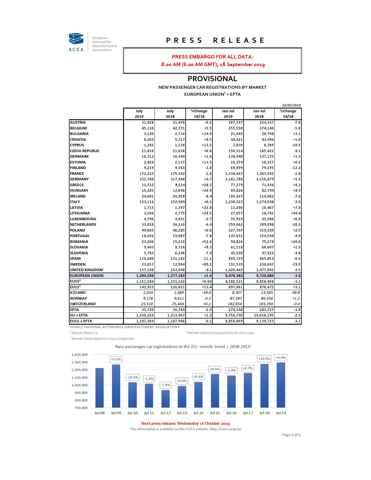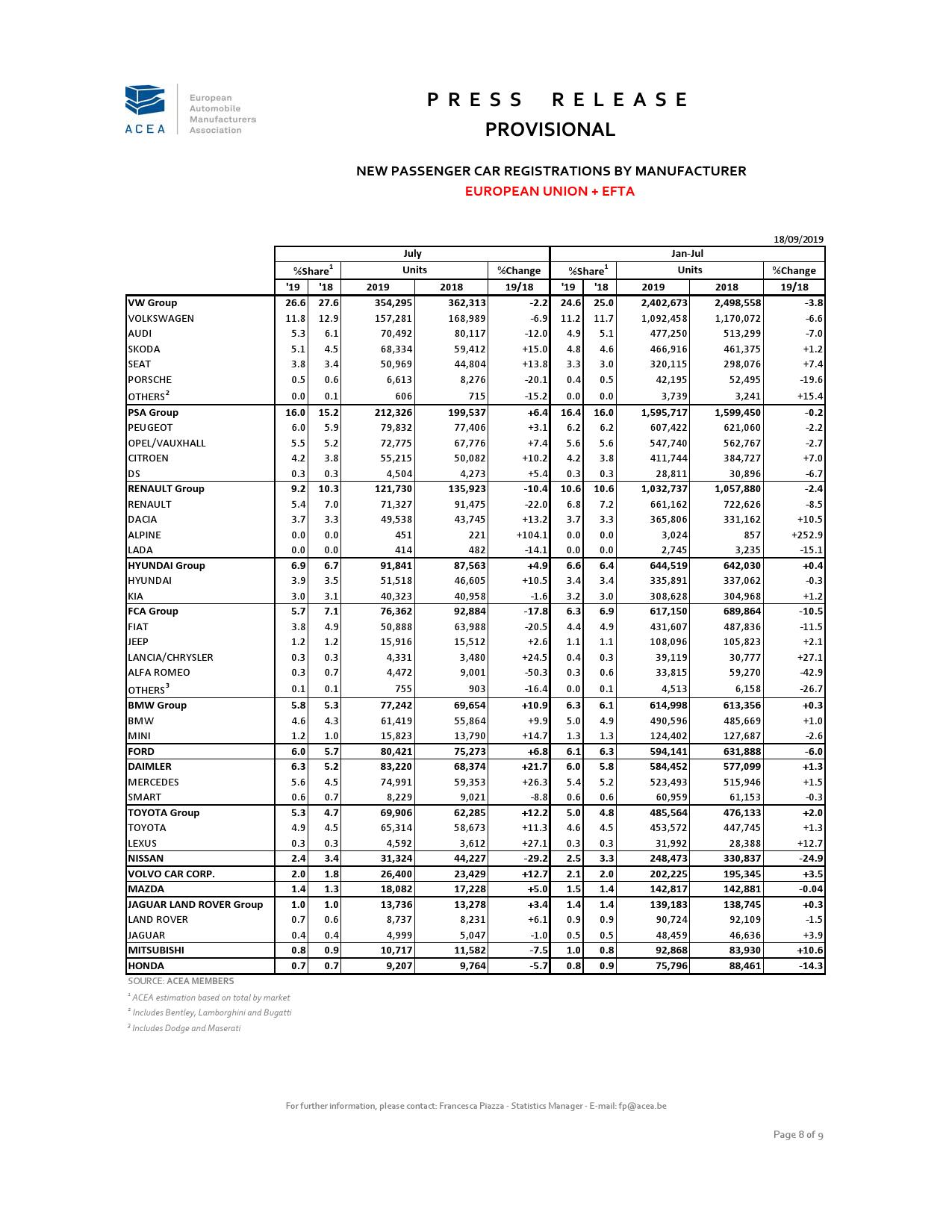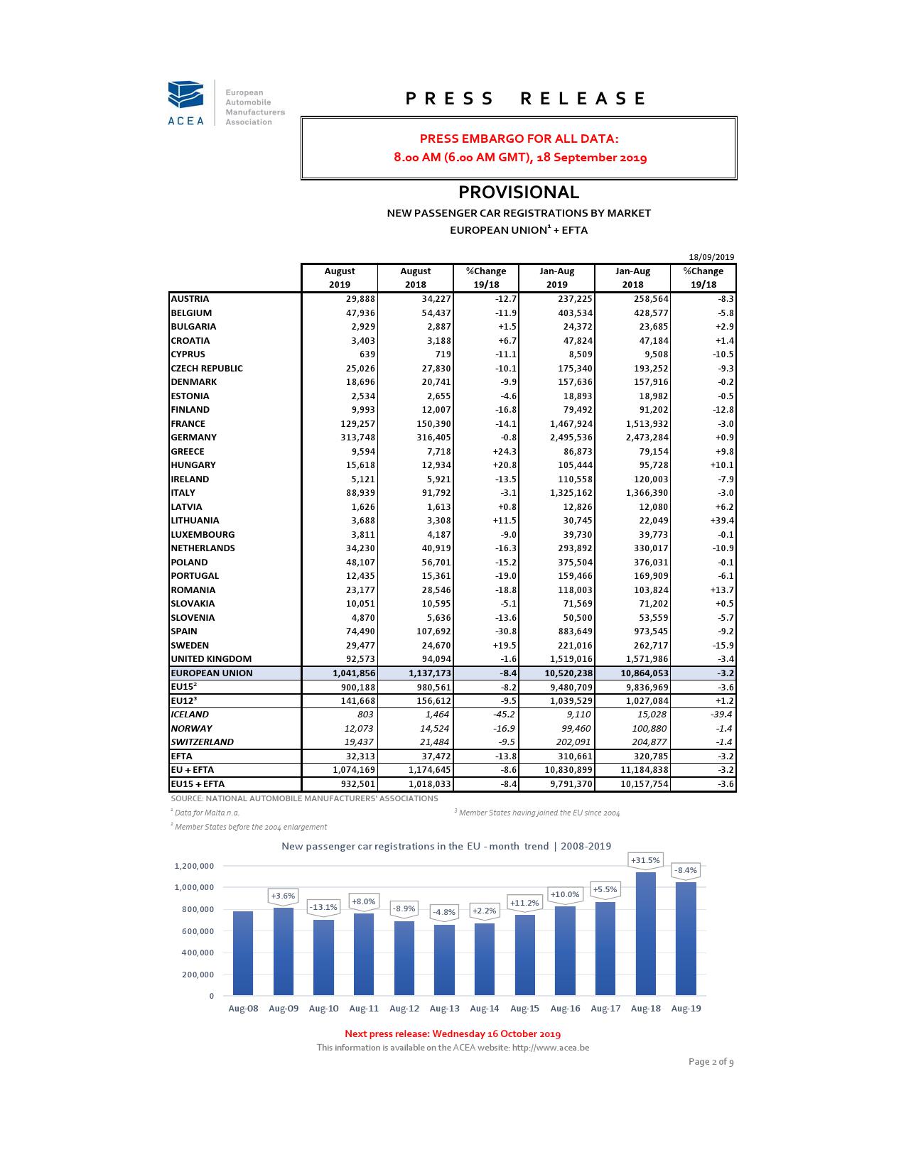 欧洲汽车制造商协会周三在声明中称, 8月份汽车销量下降8.4%至104万辆,创下2019年来最大降幅,而7月份时增长1.4%。且由于上年同期汽车制造商赶在排放测试新规之前推出车型,造成当月汽车销量增速异常之高,显得今年8月份的销量更加糟糕。