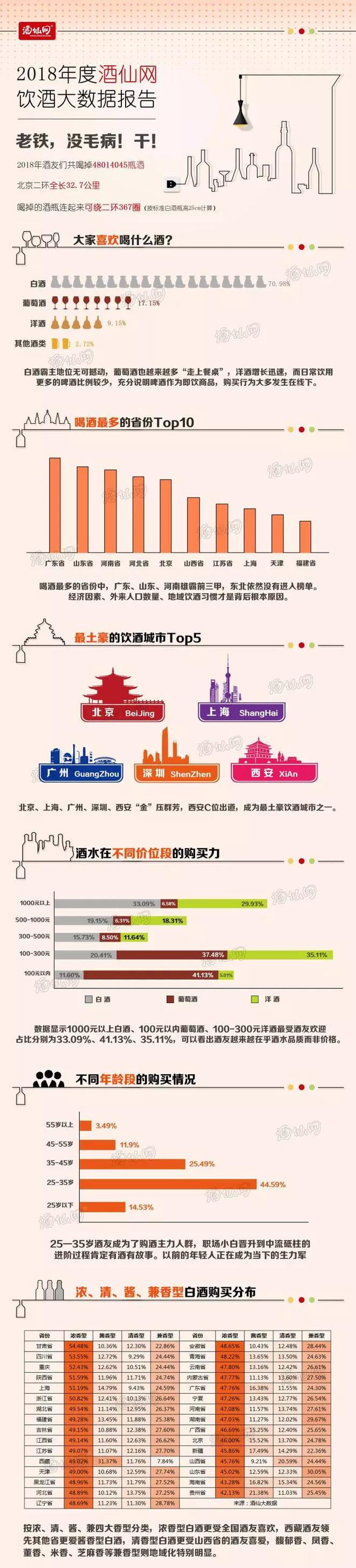 酒仙网:2018年饮酒大数据报告 2018年酒仙网饮酒大数据报告新鲜出炉。数据显示,白酒消费仍然居于绝对的主体地位,以70.98%的超高占比遥遥领先,八大名酒表现依然强劲,地位无可撼动。葡萄酒占比17.15%;洋酒占比超9%,人头马、马爹利领衔洋酒品牌。啤酒占比较少,显示了啤酒作为即饮产品,购买行为大多发生在线下。 更多阅读:《自然·医学》:北大/牛津团队分析超50万国人数据发现,饮酒与男性患61种疾病的风险上升有关ESC:与不饮酒相比 中等或高酒精摄入量使心脏健康恶化风险增加4.5倍PNAS:惊人发现!仅仅一次饮酒或许就足以改变大脑!《自然通讯杂志》:每天饮用一至两杯酒大脑相当于衰老两年《自然·通讯》:每天两瓶啤酒 大脑或老十年澳大利亚昆士兰科技大学:研究显示澳洲中年女性群饮酒最多微信支付:2019微信支付小商家经营大数据报告WINA:2018年全球消费方便面达1036亿份凯谛思:2018年可持续城市指数报告科尔尼:2018年全球城市报告高和资本| 房地产的历史、生态图谱和地产科技勾正数据:2020年7月智能电视大数据报告OYO酒店:2019暑期大数据报告联通:2019年春运出境游大数据报告景远研究|“金科新区”新政解读之“金科十条”