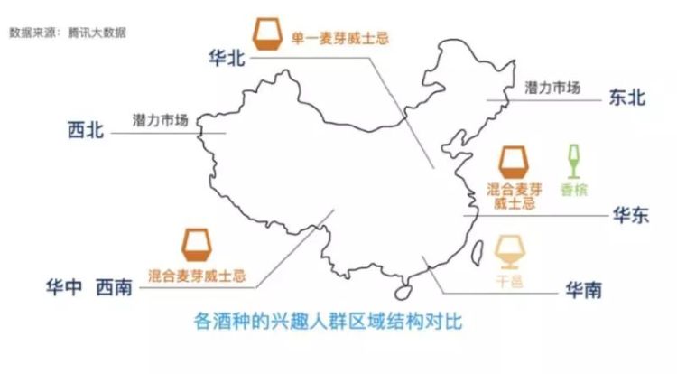 作为一个特例存在的是干邑,干邑在广东的普及度非常高,与其他酒种在广东地区的分布形成了鲜明反差。值得一提的是,四川、重庆、陕西聚集了许多混合麦芽威土忌的粉丝,也许这正是酒吧文化盛行的中部地区在洋酒文化上的一大标志。
