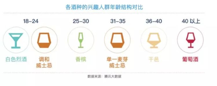 18-24岁洋酒入门阶段的人群偏爱白色烈酒和调和威士忌,25-30岁的消费者倾向于香槟。随着年龄增长,事业逐渐上升,单一麦芽威士忌、干邑在30-40岁段的年龄结构比,逐渐超越了其他酒种。40岁后,人们对葡萄酒的偏好度显著提升。