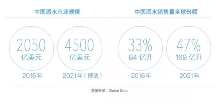 根据Global Data预测,中国酒水市场将有望于2021年达到4500亿美元,这一数字是2016年的2.2倍,同时占全球销售量的份额将从2016年的33%上涨到2021年的47%,达到169亿升。