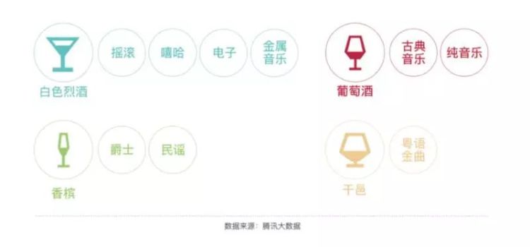 洋酒粉丝普遍偏好“欧美音乐”,“电音”“摇滚”最受烈酒人群偏爱。他们最爱特立独行的陈冠希和Jony J;混合麦芽威士忌的爱好者是华晨宇的狂热粉丝,比例超过普通人群8倍。葡萄酒爱好者则热衷于古典音乐和纯音乐,尤其是钢琴王子理查德·克莱德曼的作品,最爱的歌手是李宗盛。干邑粉丝热衷于聆听粤语金曲,歌神张学友是他们的心水选择。香槟爱好者则喜欢爵士和民谣。