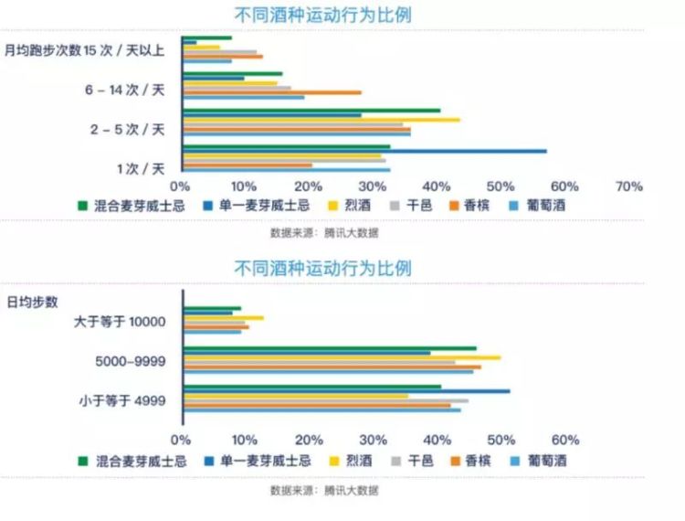 洋酒的爱好者巧妙地维持着饮酒与健康这间的平衡,“嗜酒如命”的爱好者小于10%。年轻的烈酒和混合麦芽威士忌粉最爱运动,始终保持着跑步与健步的习惯。葡萄酒粉也许整体年龄结构偏大,不常使用运动类APP,但养生体现在实际行动中,步数和跑步次数绝不落后于年轻人。与之相反的是单一麦芽威土忌粉,尽管手机里装着健身APP,但平日里步行跑步都相对懒惰(日均步数小于4999最多)。