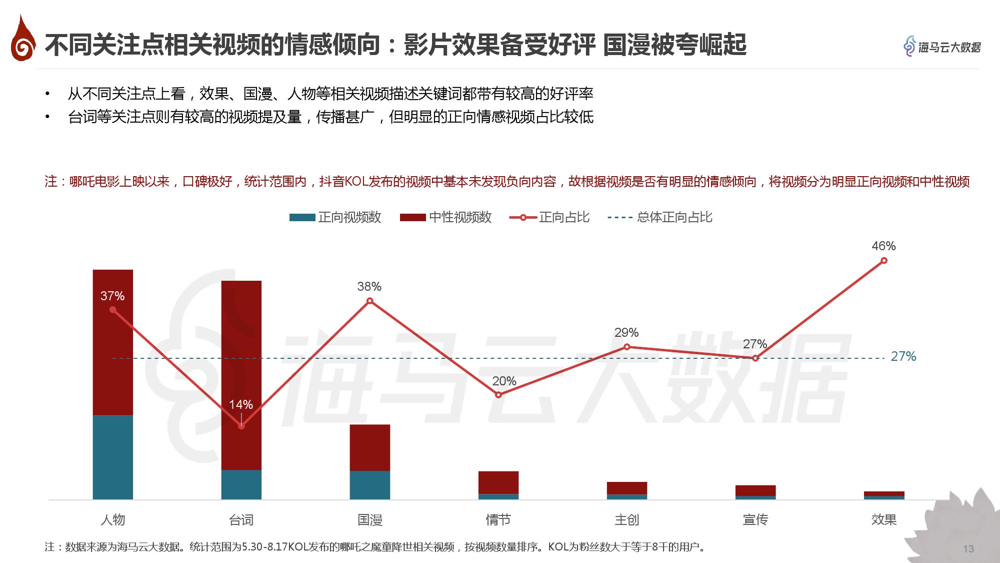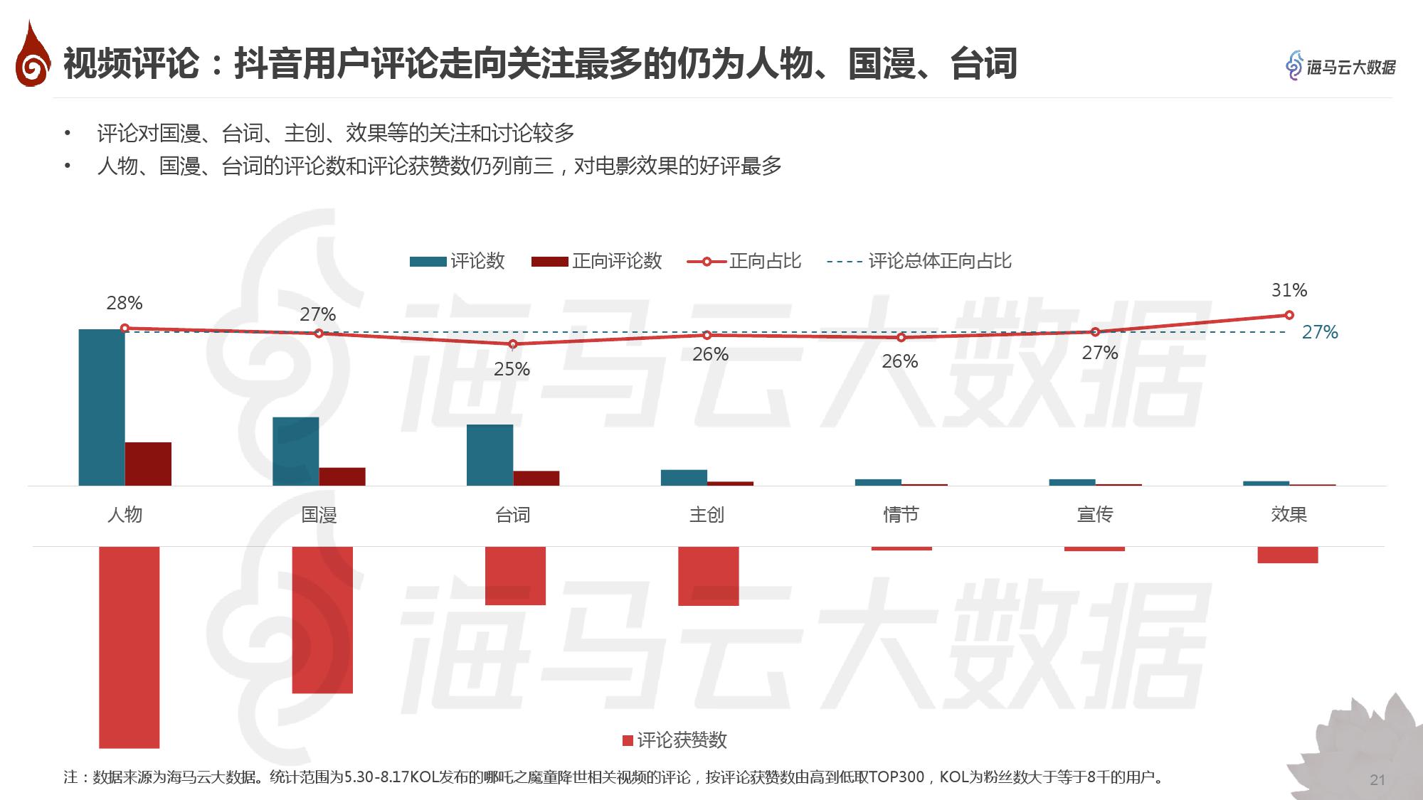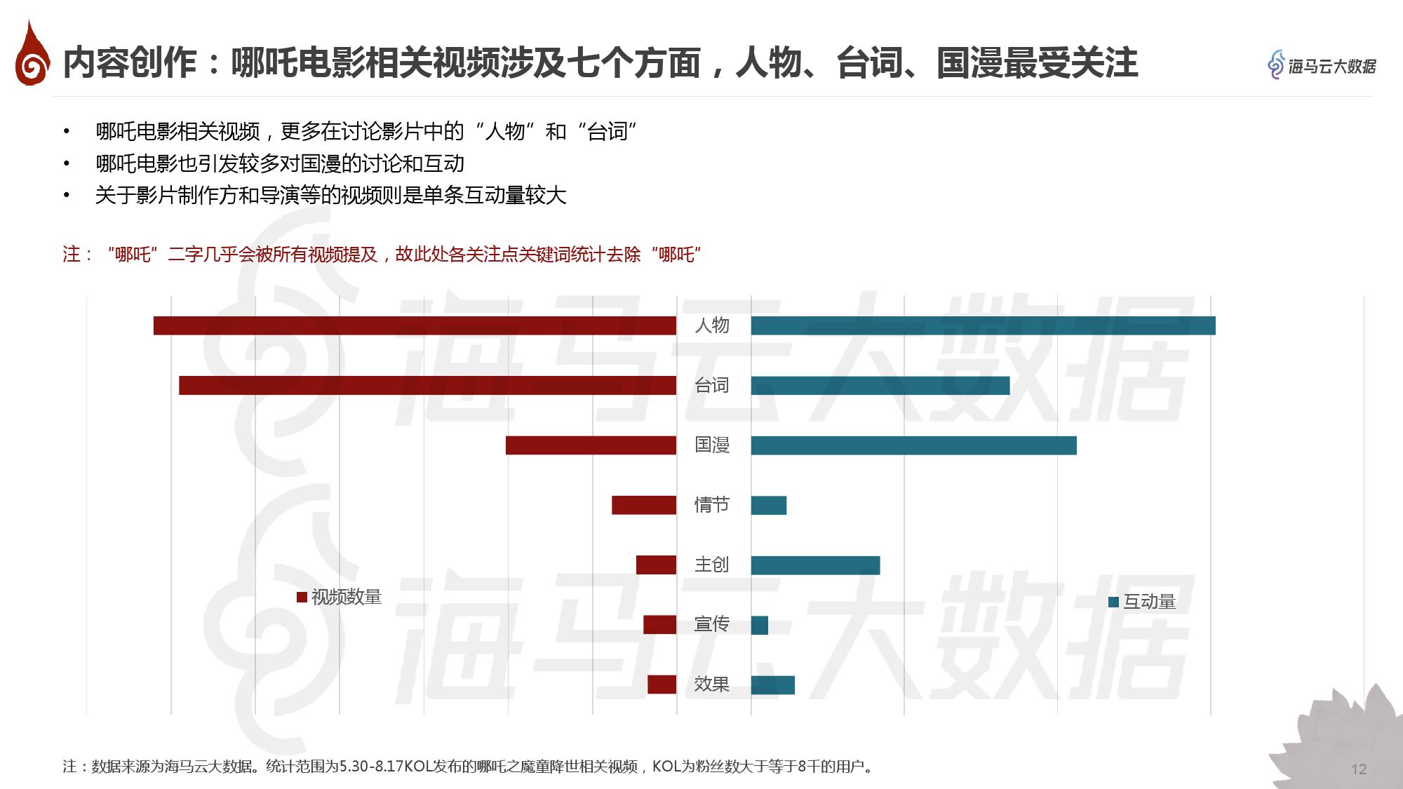 • 抖音对《哪吒之魔童降世》的内容创作主要集中在7个方面,其中人物、台词、国漫最受关注;影片效果备受好评,国漫被夸崛起