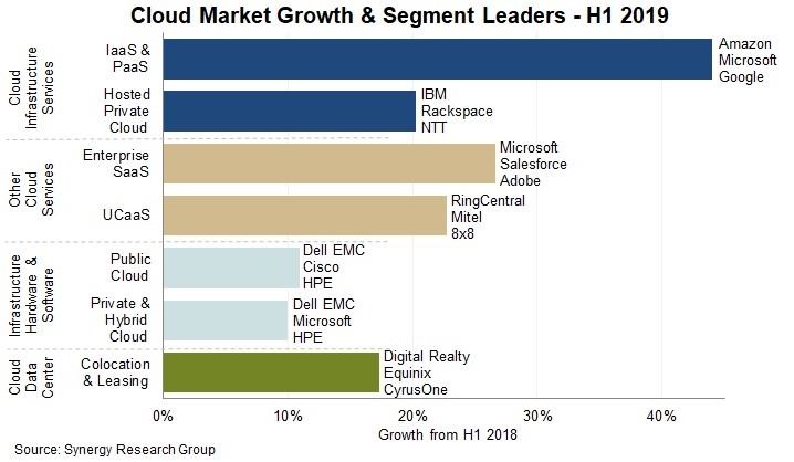 Synergy Research的新数据显示,在七个关键的云服务和基础设施细分市场,2019年上半年运营商和供应商收入超过了1500亿美元,同比增长了24%。在云服务领域,IaaS和PaaS的增长率最高,为44%,其次是企业SaaS(27%)、UCaaS(23%)和托管私有云基础设施服务(20%)。公共、私有和混合基础设施的硬件和软件支出增长略高于10%,而云提供商在主机代管和数据中心租赁方面的支出增长了17%。