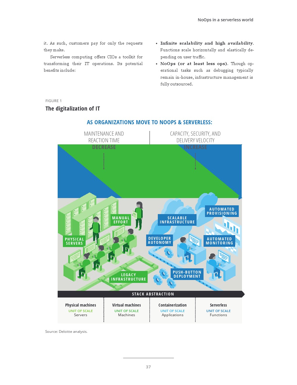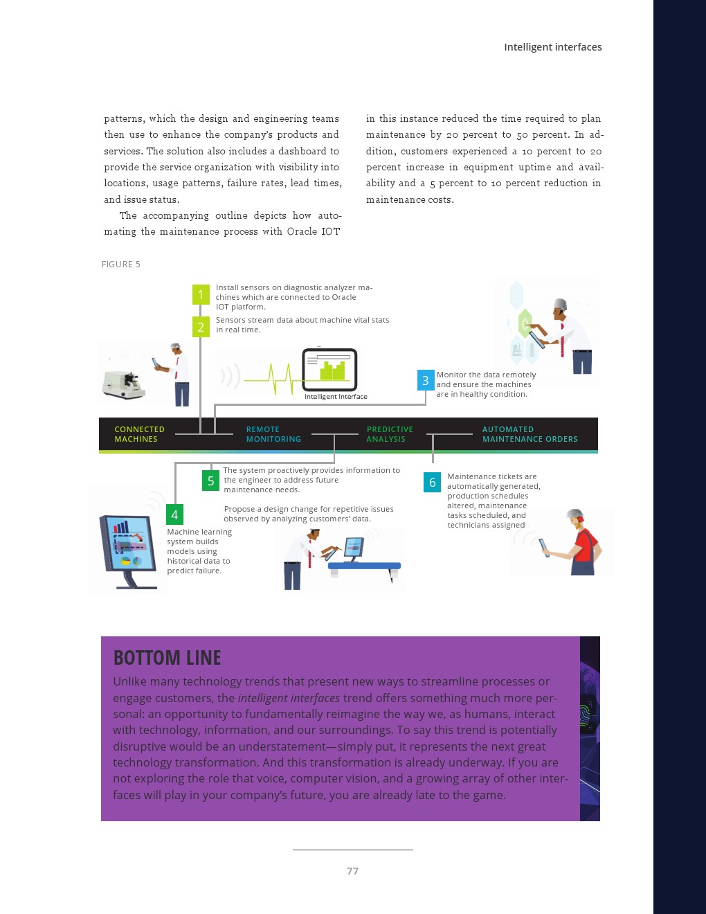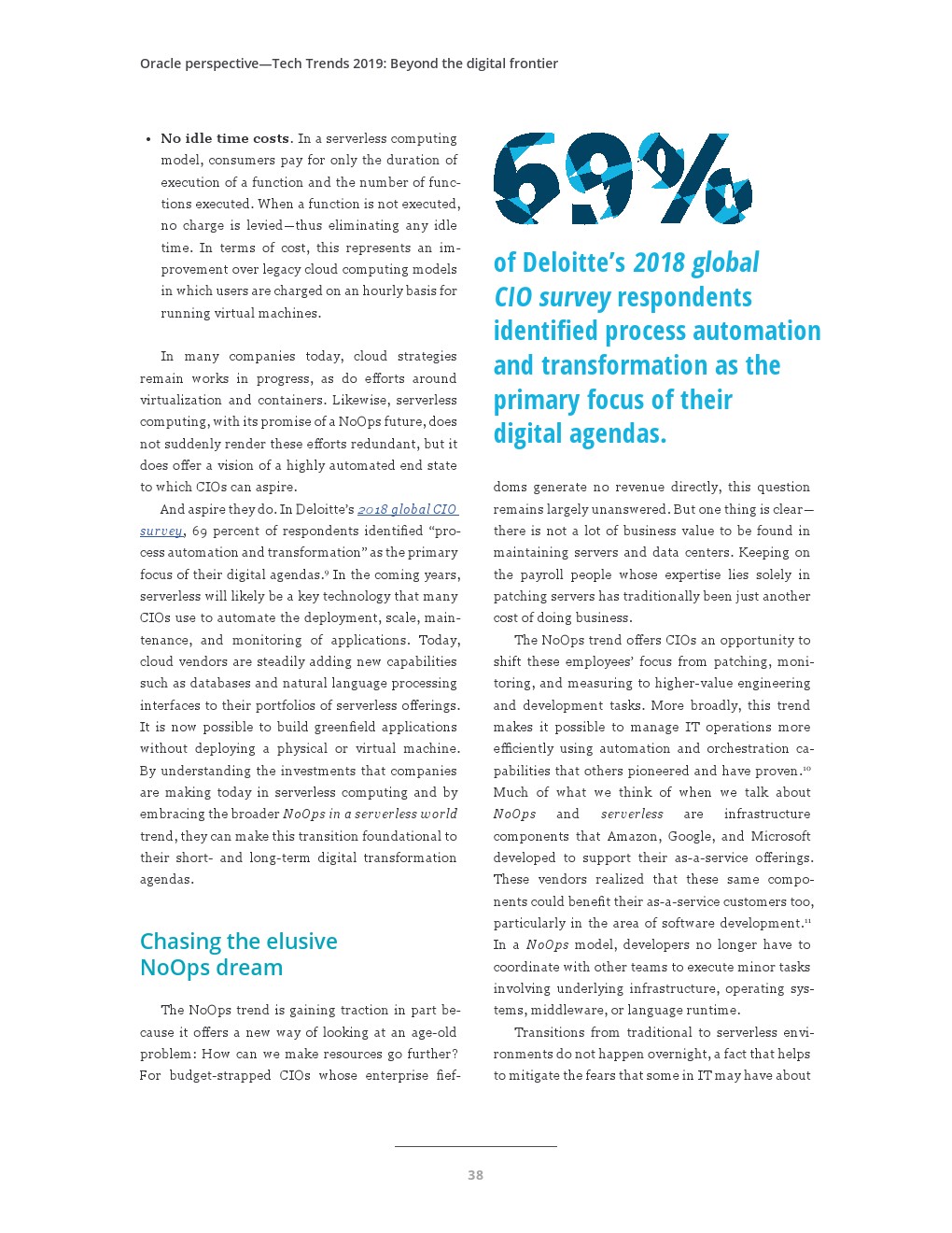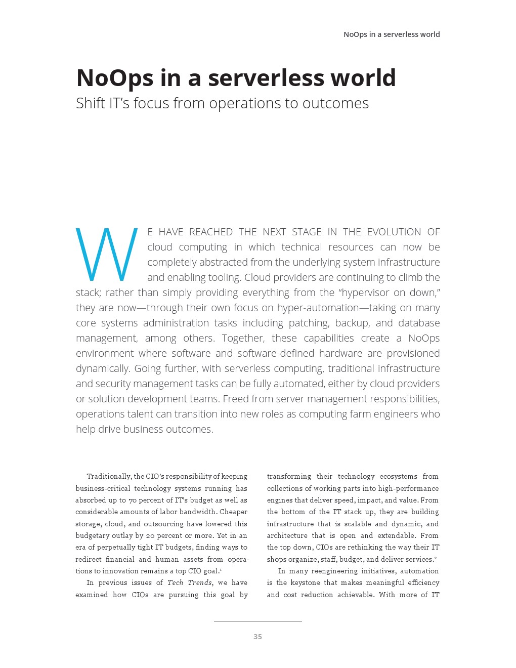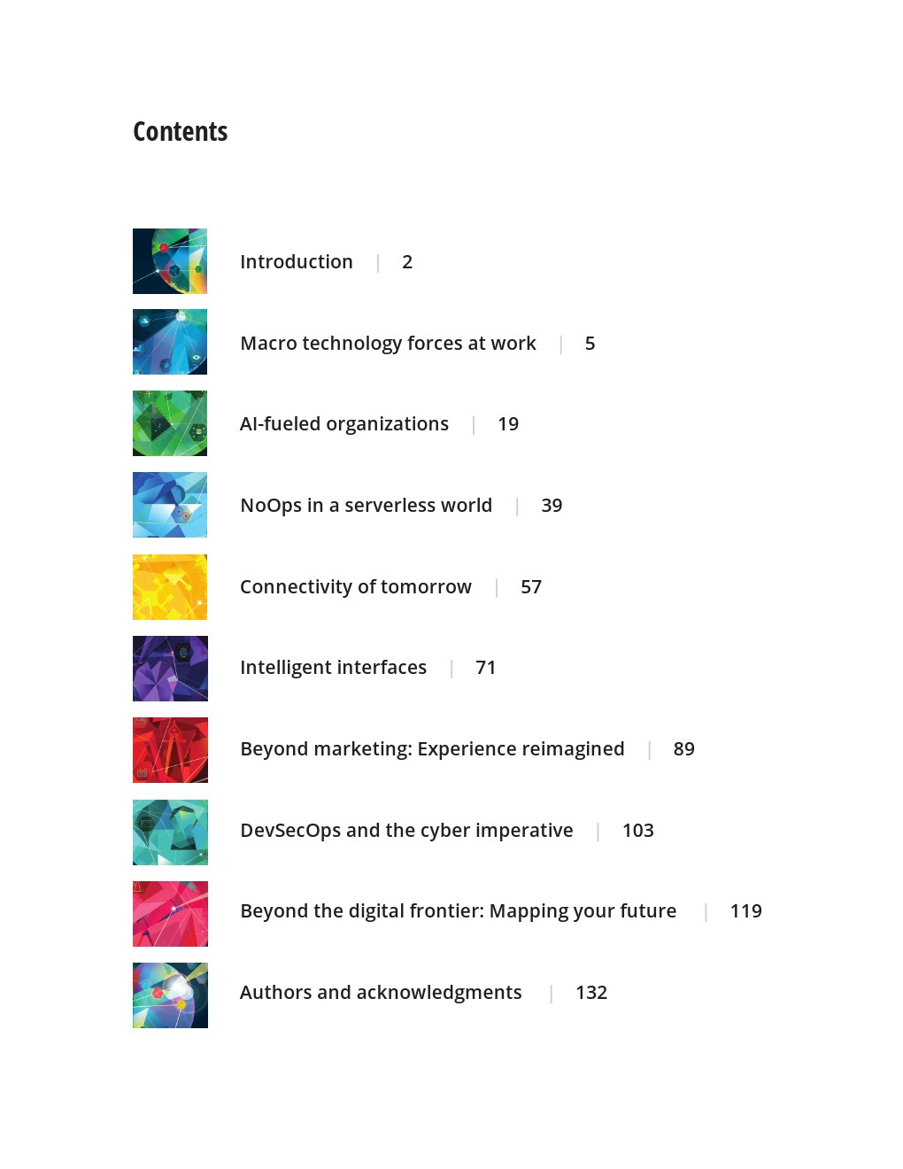 德勤在报告中分析了人工智能、NoOps(No Operations,即软件环境可以完全自动化,不需要运营团队来管理它)、先进网络、智能界面等前沿技术对企业的影响。