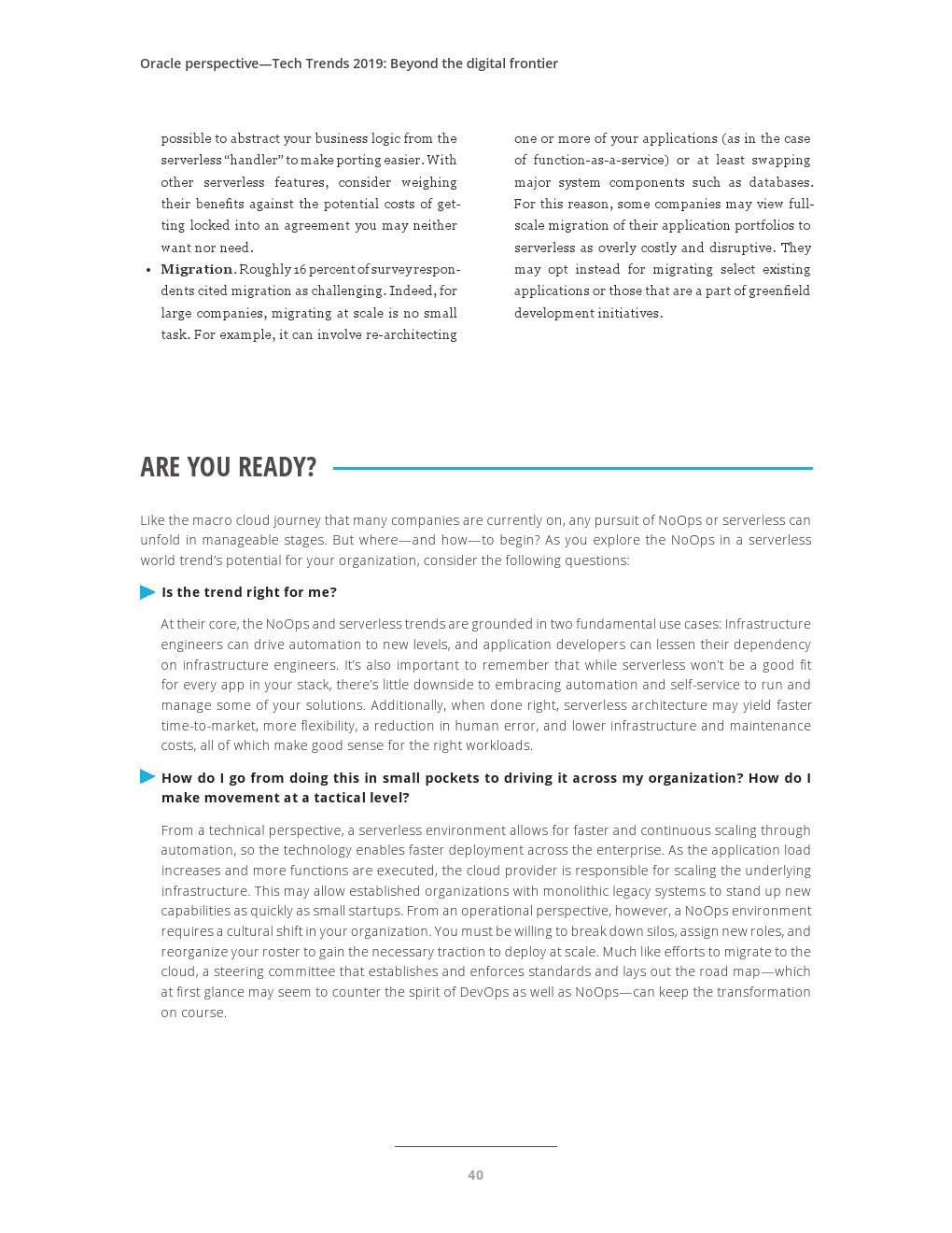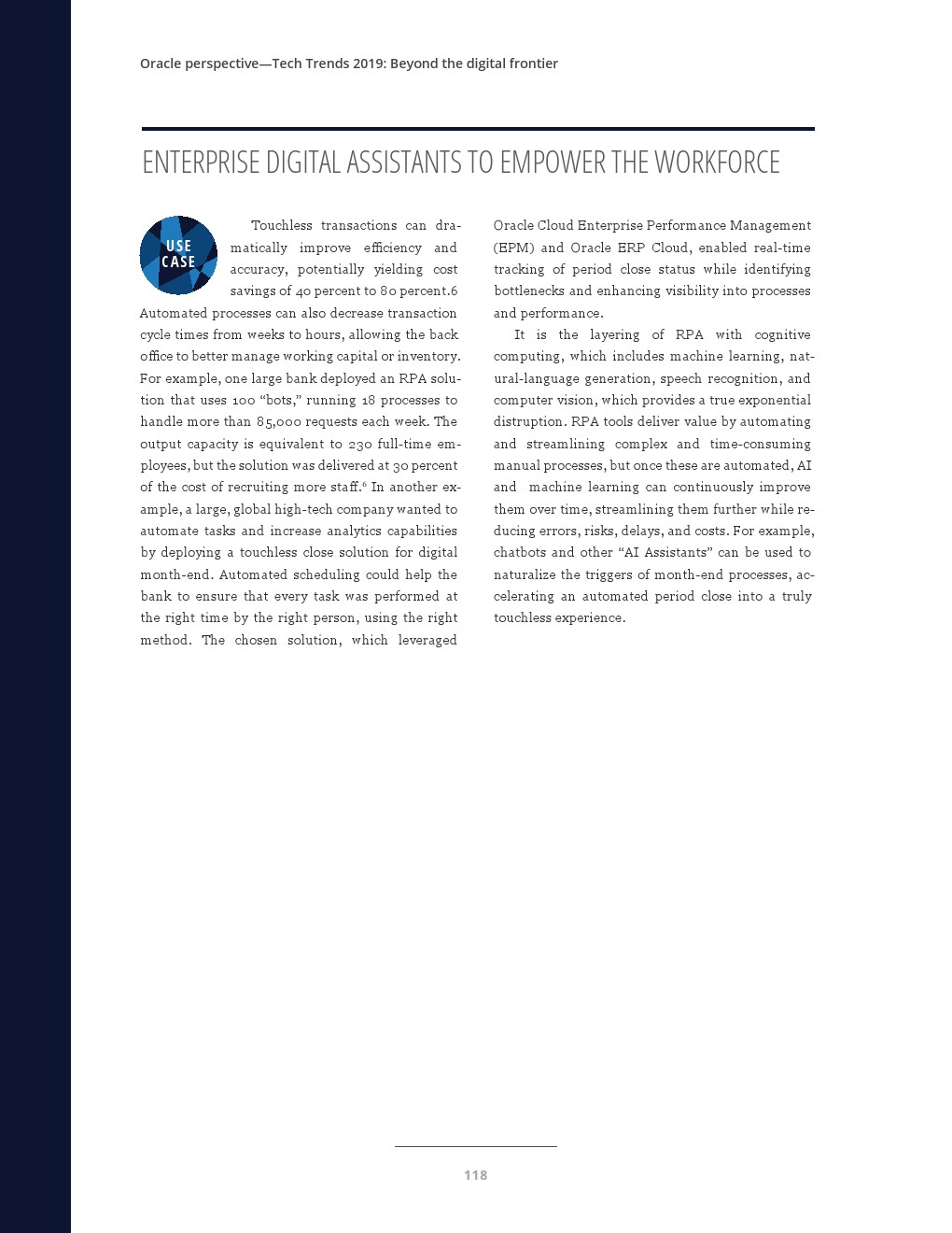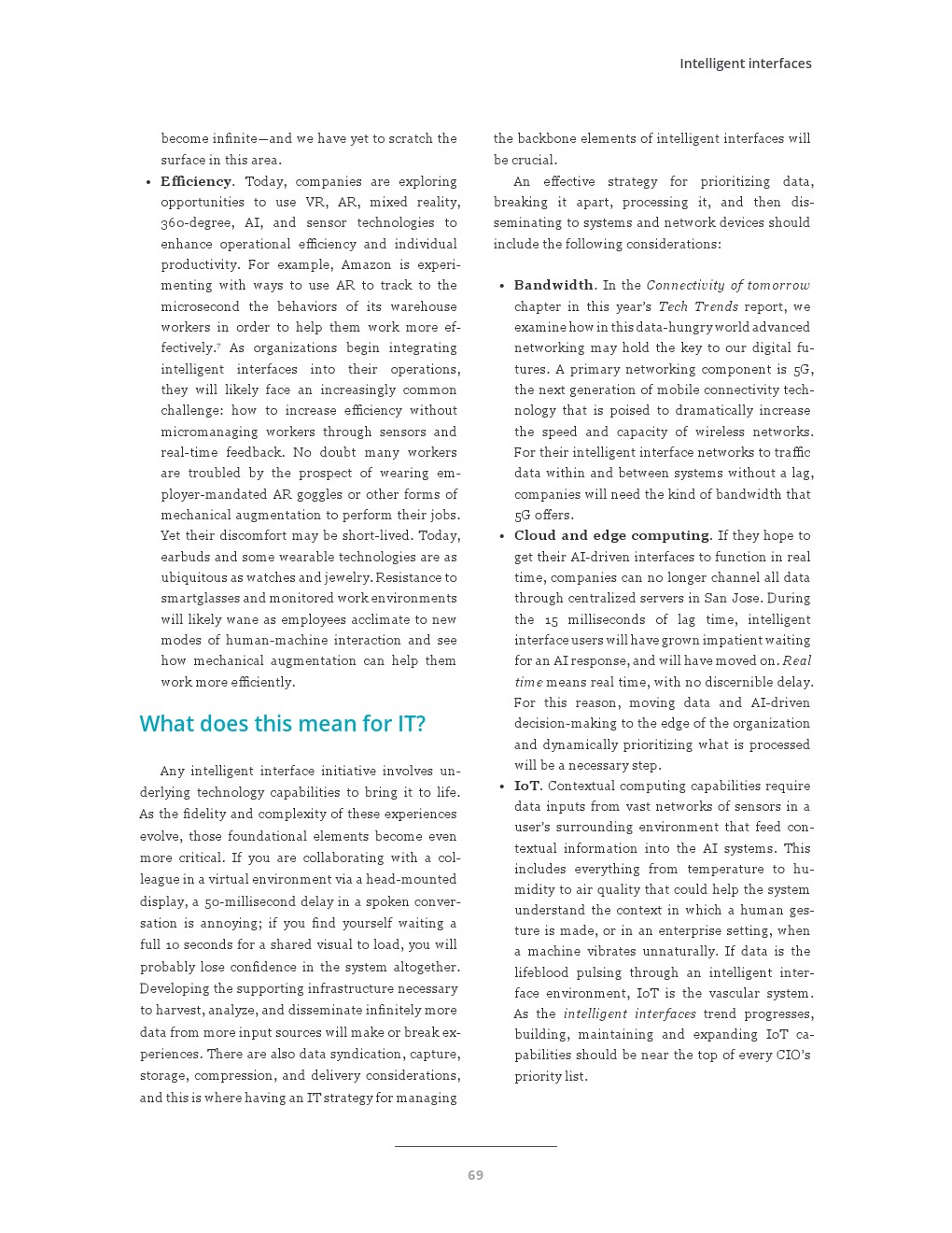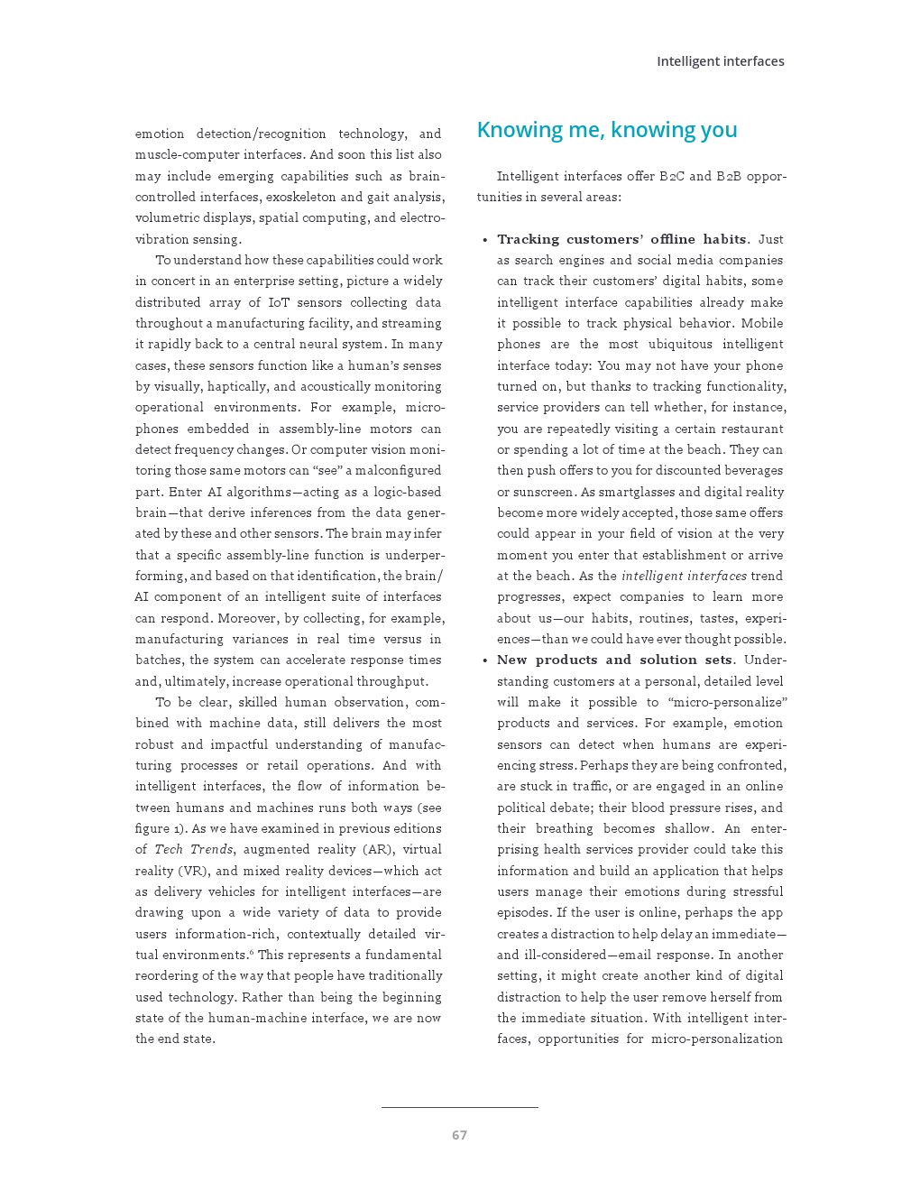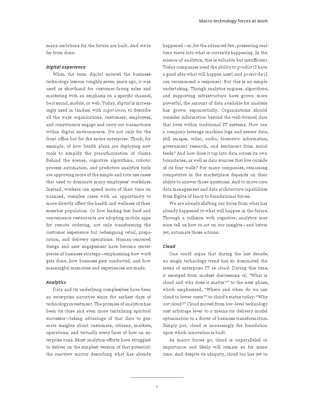 德勤在报告中分析了人工智能、NoOps(No Operations,即软件环境可以完全自动化,不需要运营团队来管理它)、先进网络、智能界面等前沿技术对企业的影响。