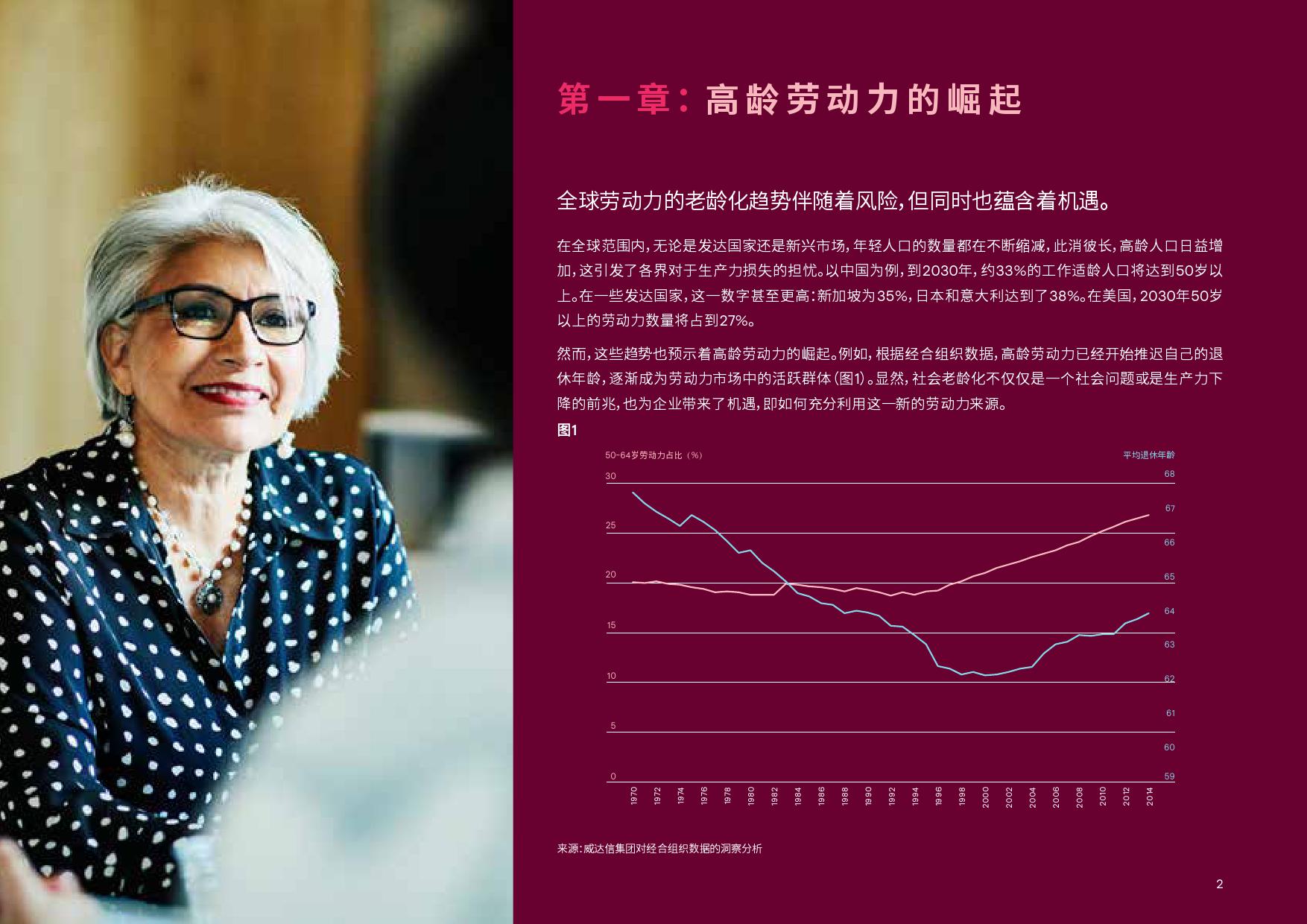 “以中国为例,到2030年,约33%的工作适龄人口将达到50岁以上。我们正在快速接近史上最重大的世代临界点。到2030年,以中国为例,约33%的工作适龄人口将达到50岁以上。在一些发达国家,这一数字甚至更高:新加坡为35%,日本和意大利达到了38%。在美国,2030年50岁以上的劳动力数量将占到27%。“