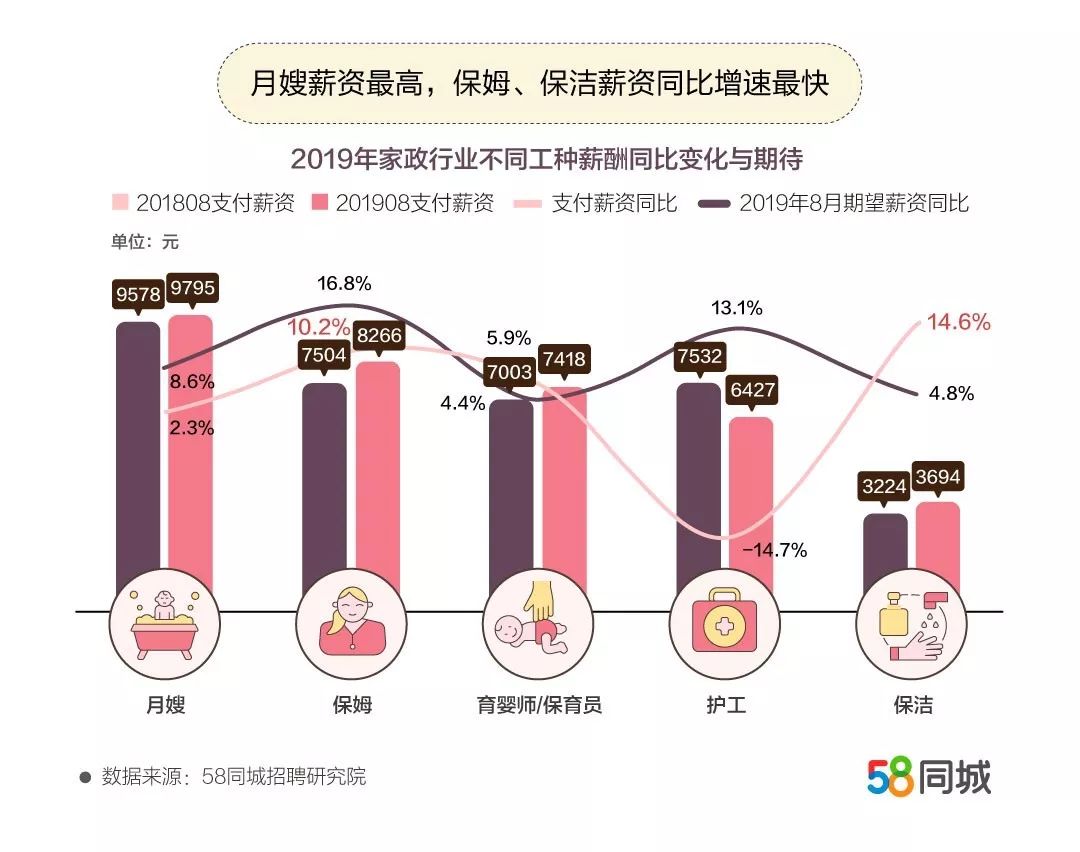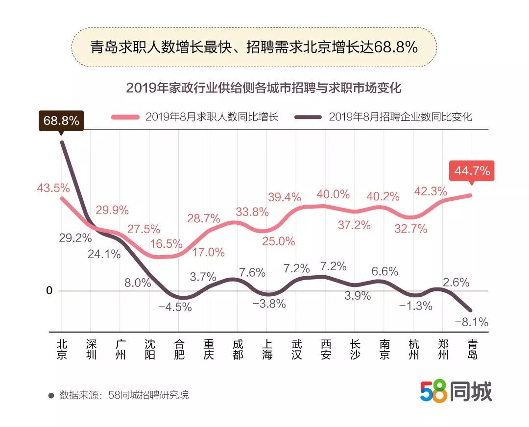 为了厘清当前家政行业的招聘需求、岗位要件、薪资水平、从业者情况及消费习惯,58同城对家政行业求职者、用工企业、消费者进行了深度的调研,并发布了《中国家政市场就业及消费报告》。据58同城招聘研究院数据显示,2019年8月北京招聘需求同比增长68.8%,深圳求职活跃度最高;2019年8月家政行业薪资整体上涨,家政行业中月嫂月均薪资达9795元,消费者雇请保姆平均周期13.6个月;70后对家政服务依赖性最大,做事麻利认真是消费者对家政从业者的第一需求。