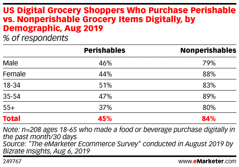 Bizrate Insights在2019年8月进行的一项调查发现,在线消费者购买非易腐物品的可能性是易腐物品的两倍。过去一个月在网上购买食品杂货的消费者中,84%购买了非易腐食品,例如,包装零食、干货等;只有45%的人购买易腐食品,如新鲜肉类、冷冻蔬菜等。