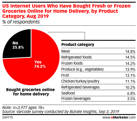 Bizrate Insights和Varcode进行的另一项调查发现,25.8%的网民以前曾在网上购买过送货上门的新鲜或冷冻商品,包括肉类(57%)、冷藏食品(56%)和冷冻食品(55%)。
