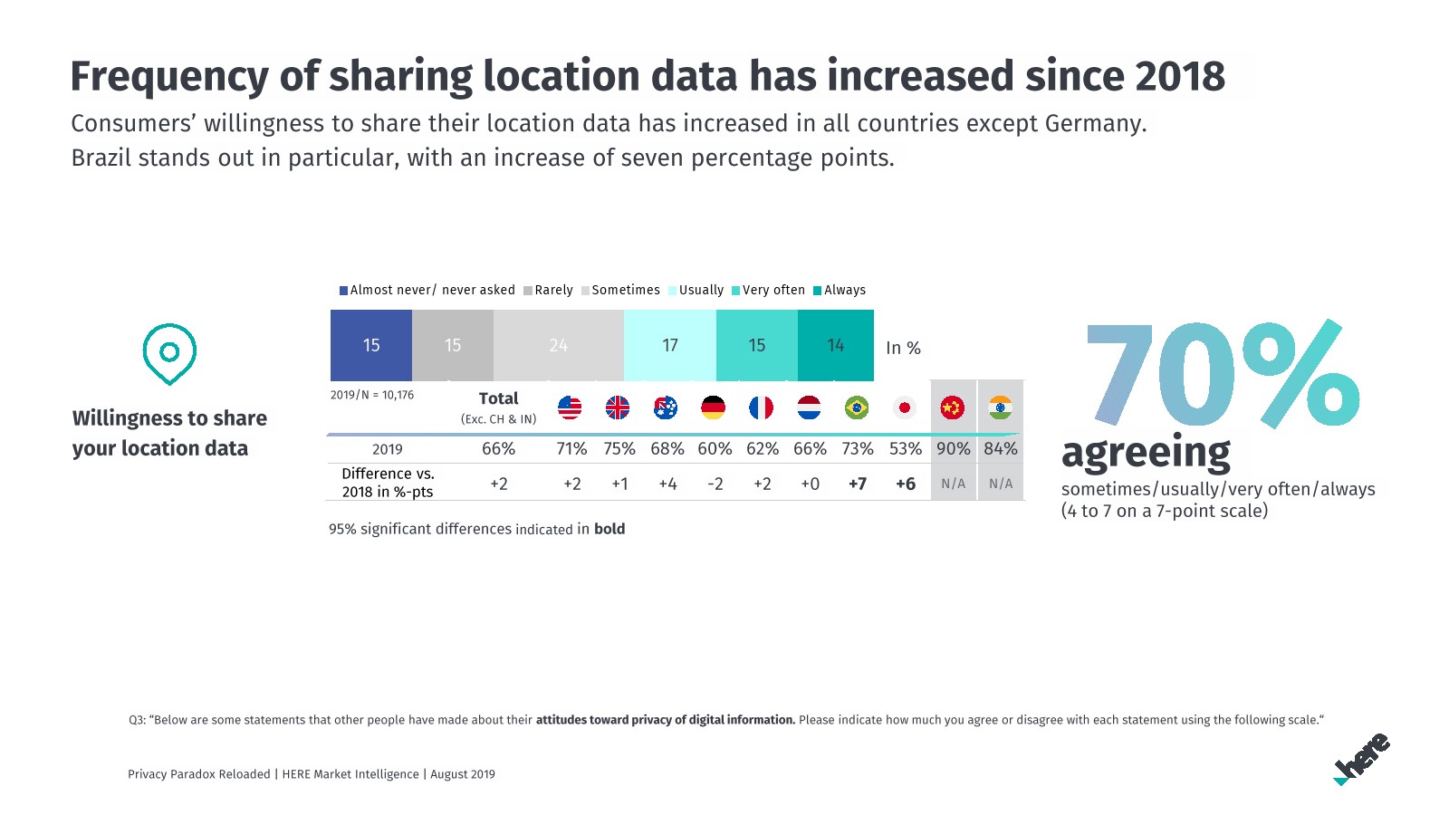 消费者比2018年更频繁地分享他们的位置数据,特别是在巴西。