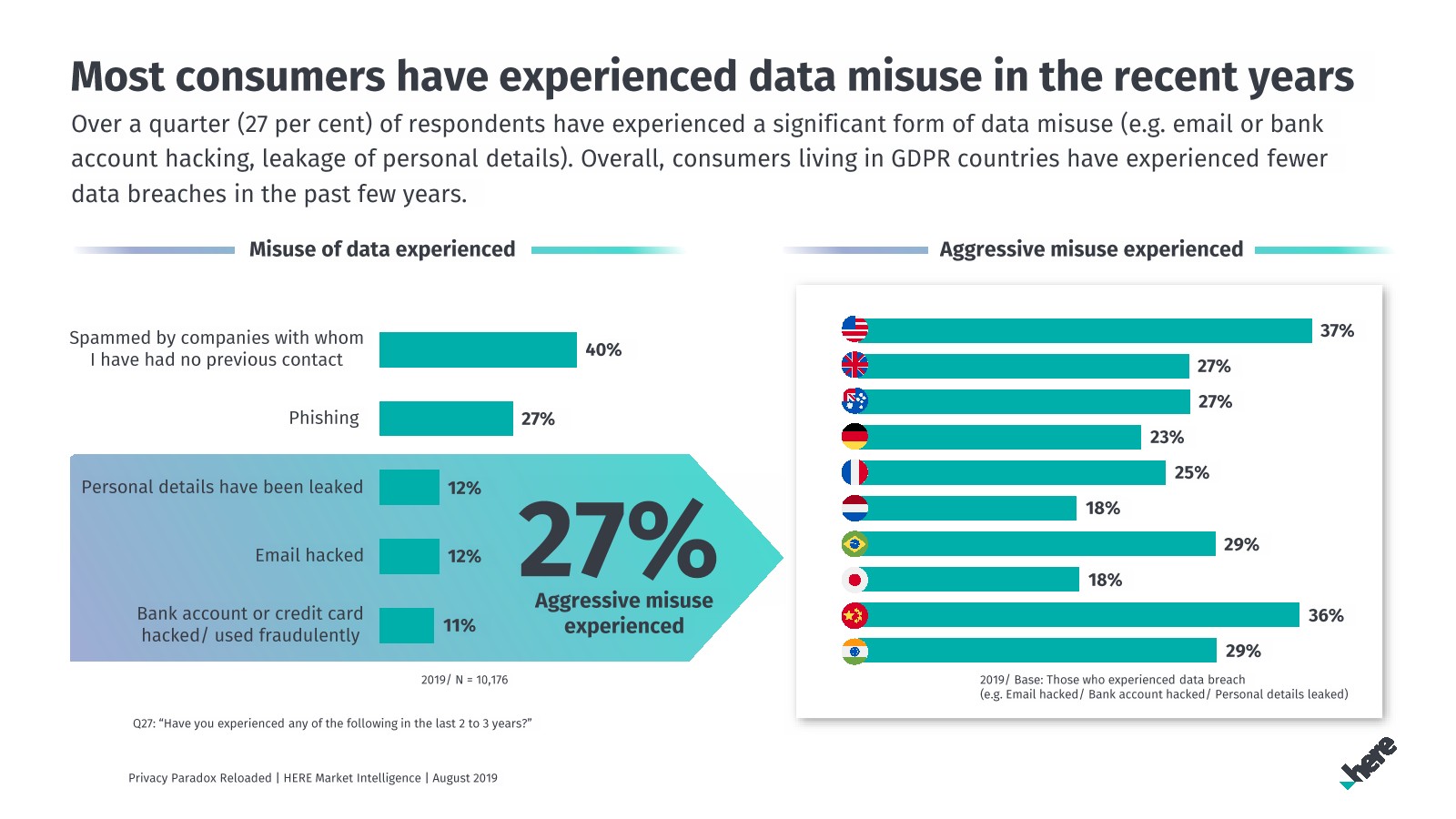 但是大多数受访者(3/5)在过去两三年内经历过数据被滥用的情况。这包括垃圾电子邮件、网络钓鱼,以及黑客攻击银行帐户/信用卡。