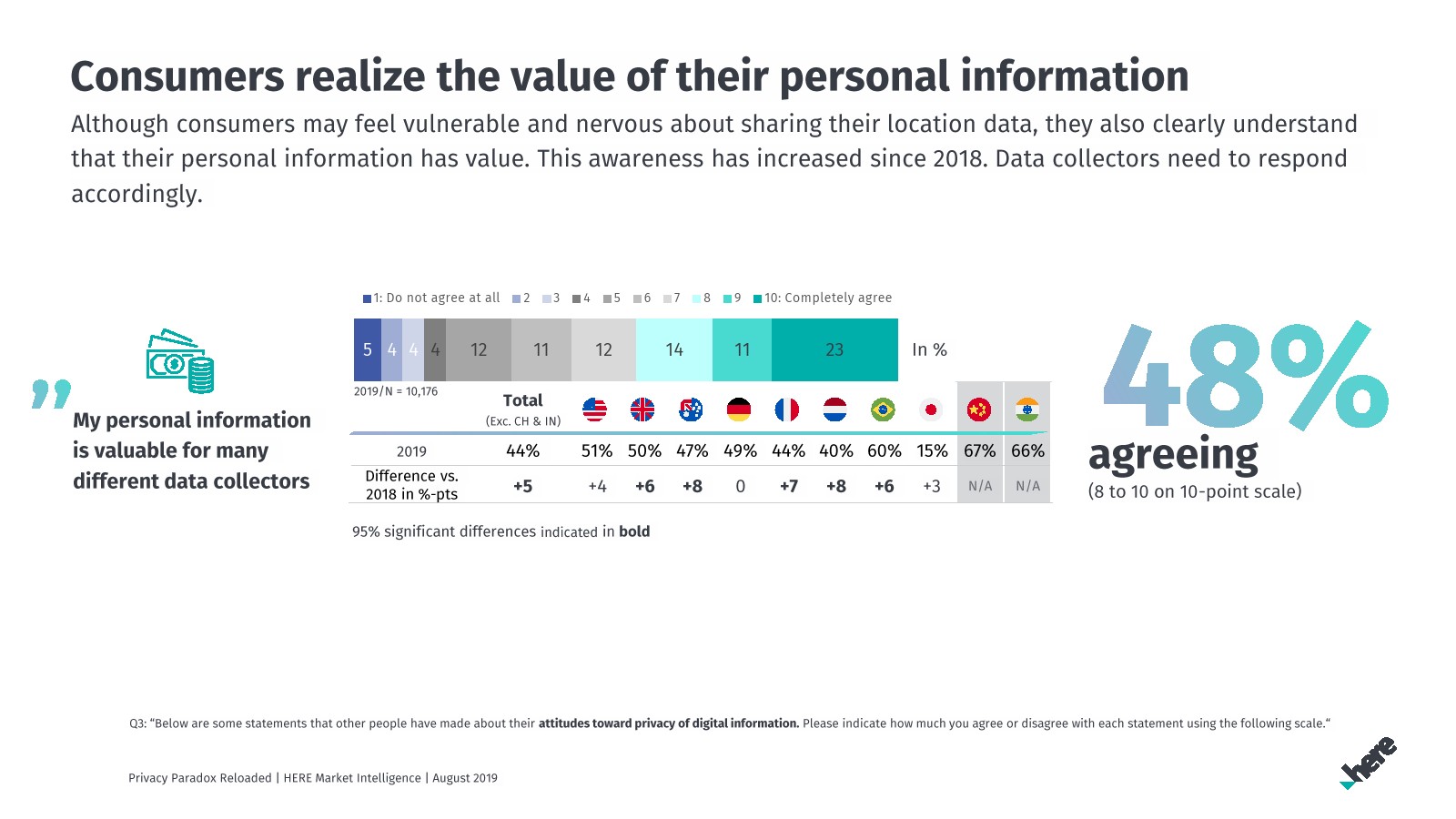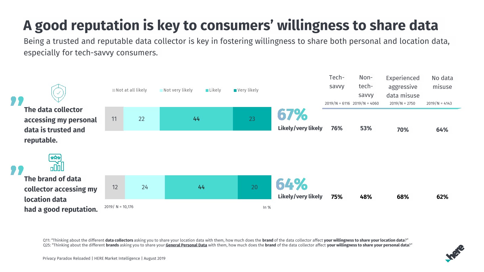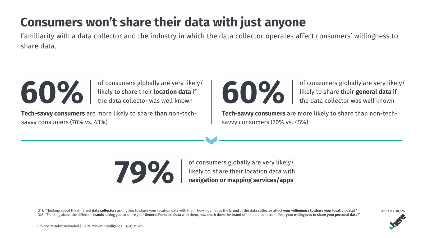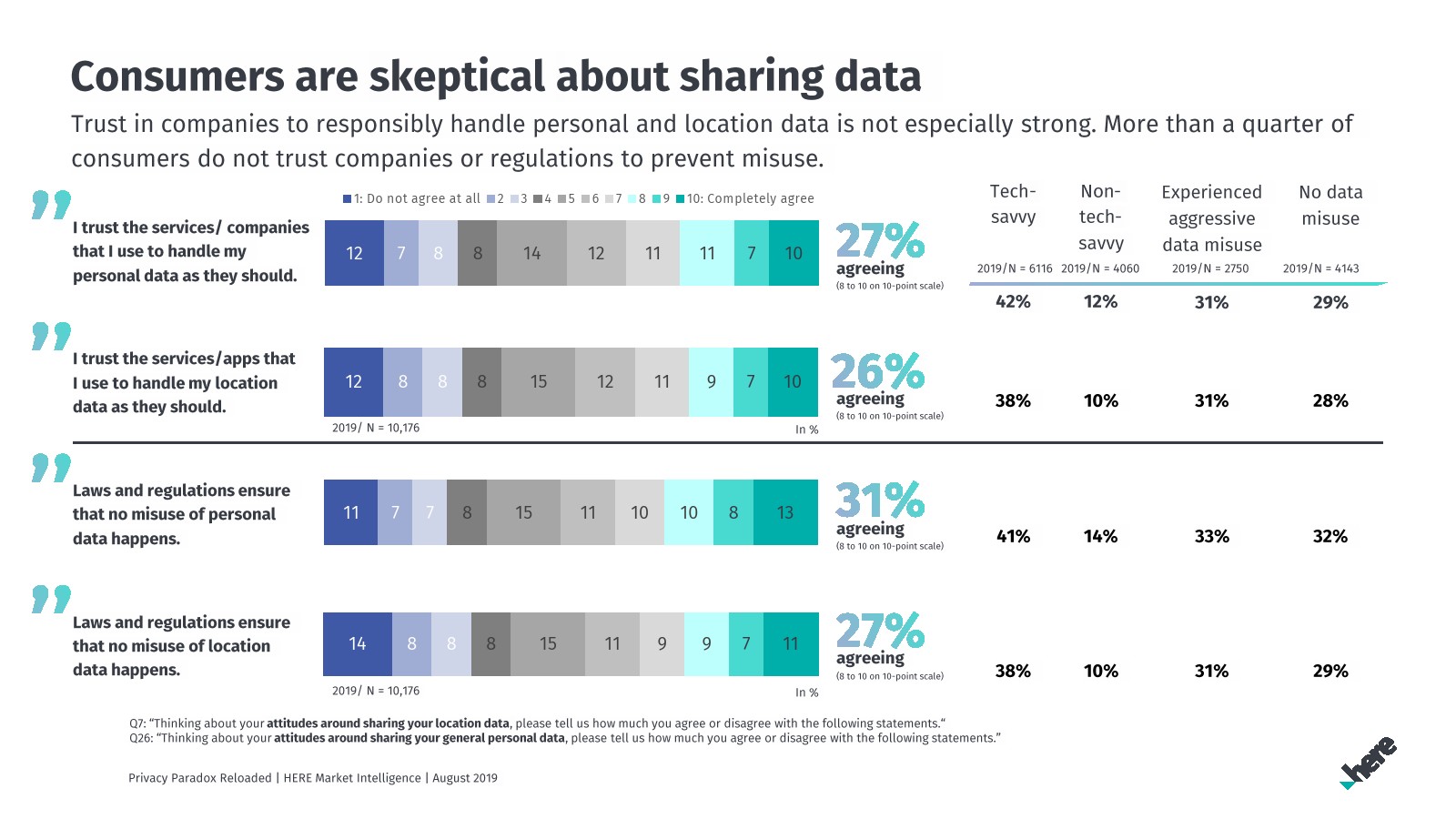 信任仍然是消费者愿意分享个人数据和位置数据的一个重要因素。人们对政府和防止滥用数据法规的信任程度仍然很低。