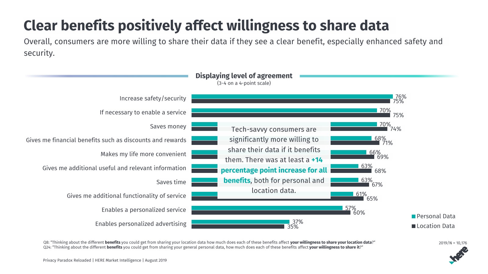 尽管担忧,但消费者更愿意共享其数据以换取诸如增强安全性或财务奖励之类,并承认提供收益将提高他们共享数据的可能性。