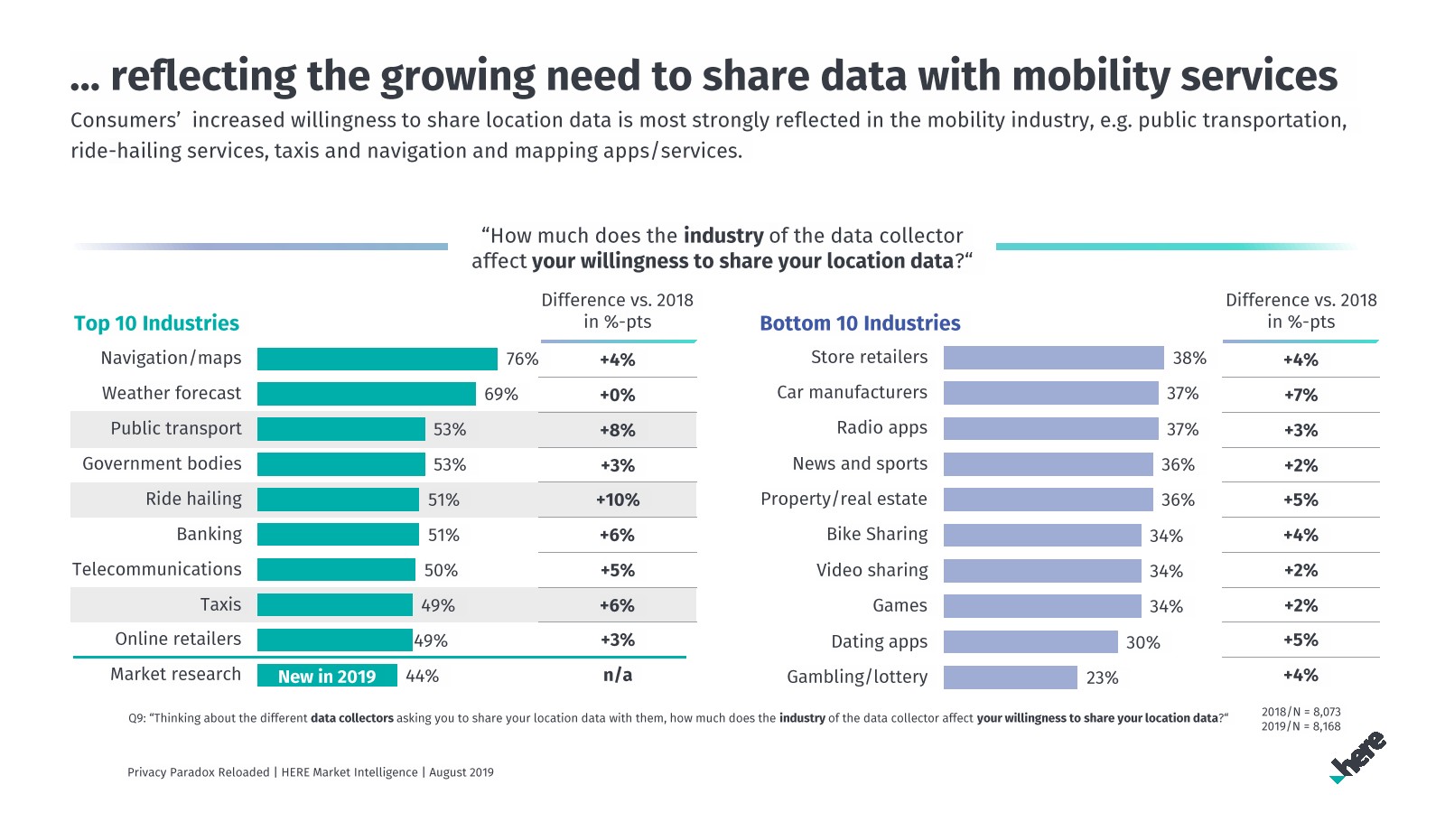 在2018年的研究中,消费者与公共交通和叫车服务分享数据的意愿上升最多。这反映了移动市场的增长。