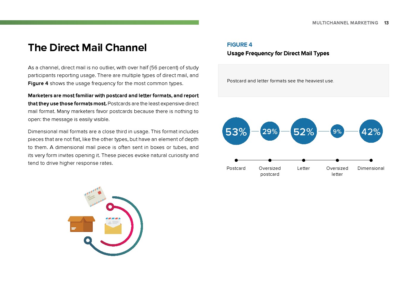 明信片(53%)和信件(52%)是营销人员在直邮活动中使用最多的形式。超过2/5的受访者(42%)使用有维度的邮件,即非扁平的、有深度元素的,如盒子或管子。