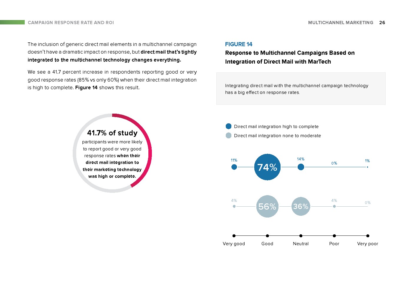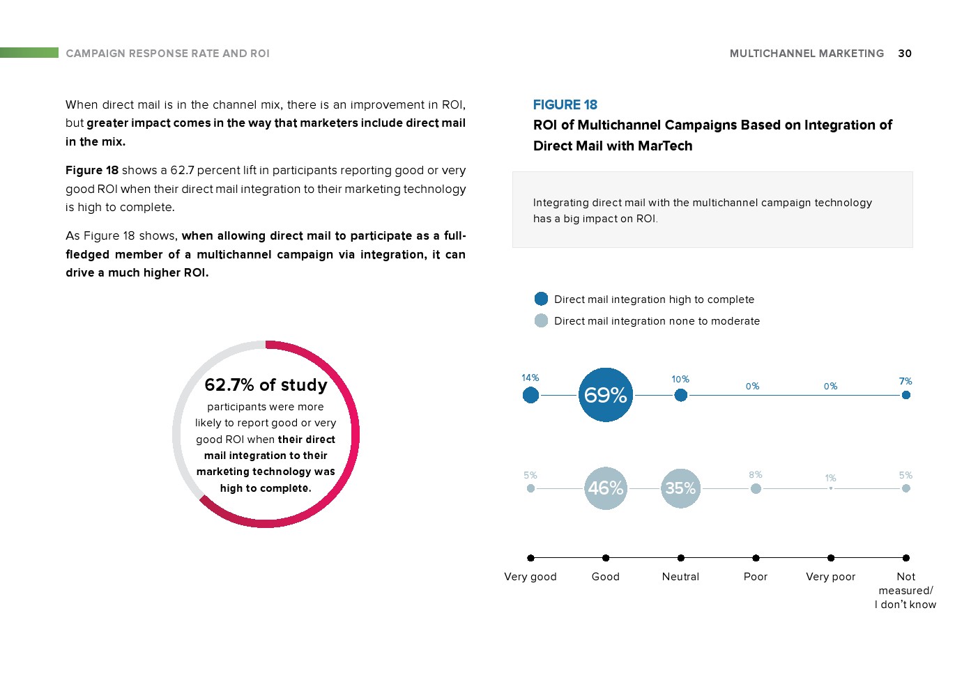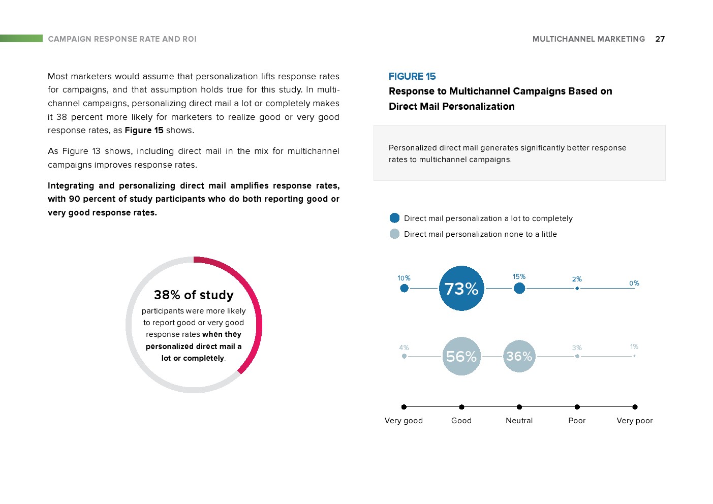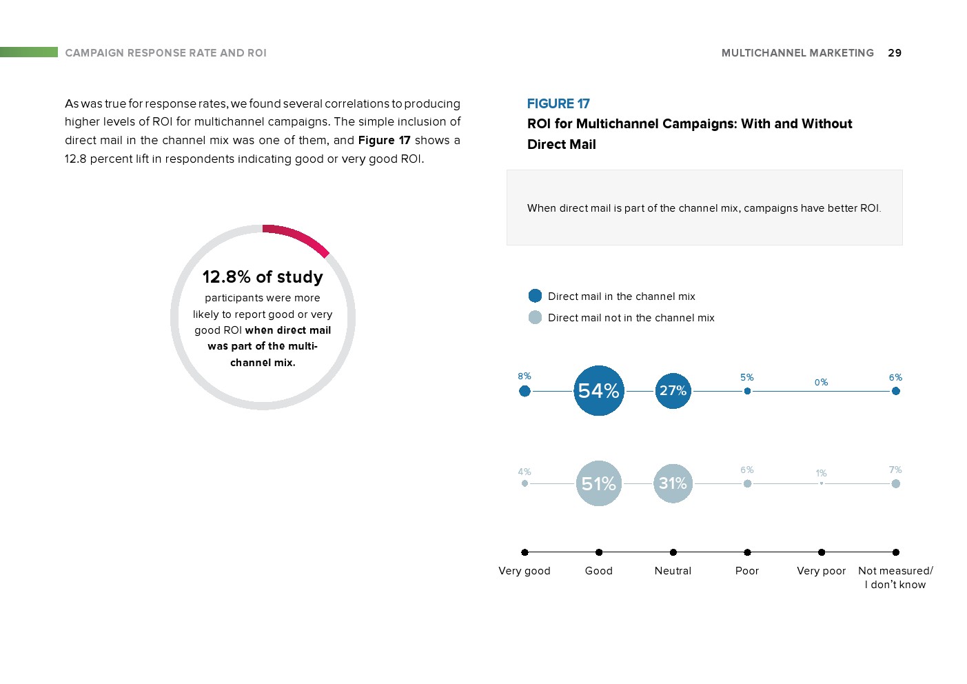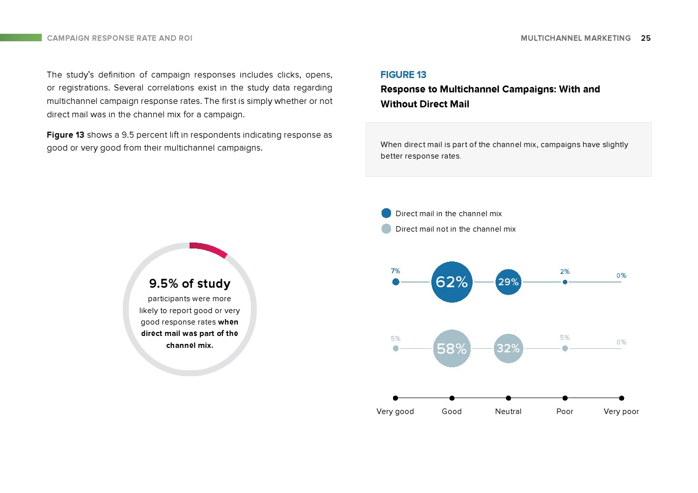 如果在多渠道广告系列中包含直邮,则响应率比不包含直邮的广告系列更高。大约69%的受访者表示,直邮是渠道组合中的一部分时,响应率非常好;相比之下,不使用直邮的广告系列则为63%。