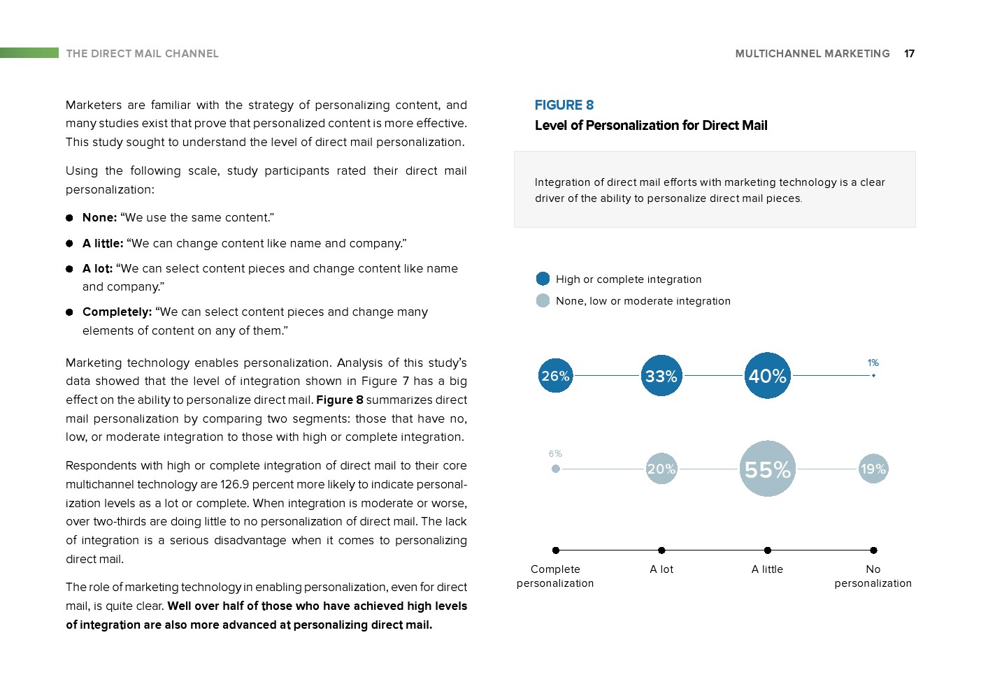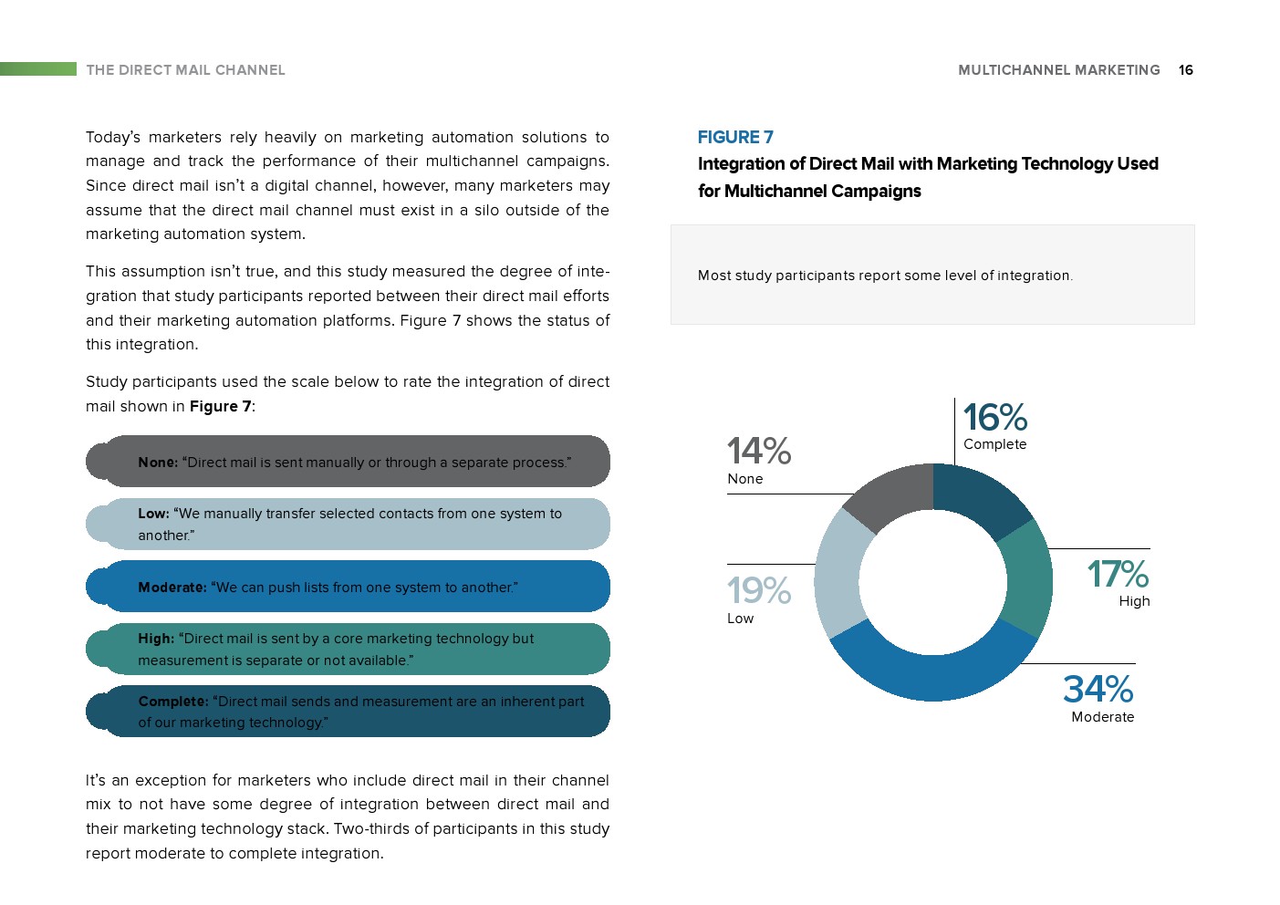 2/3的受访者(67%)表示,他们的直邮和营销自动化平台之间至少有中等程度的集成。59%的直邮营销人员表示他们有很高或完全的集成水平。