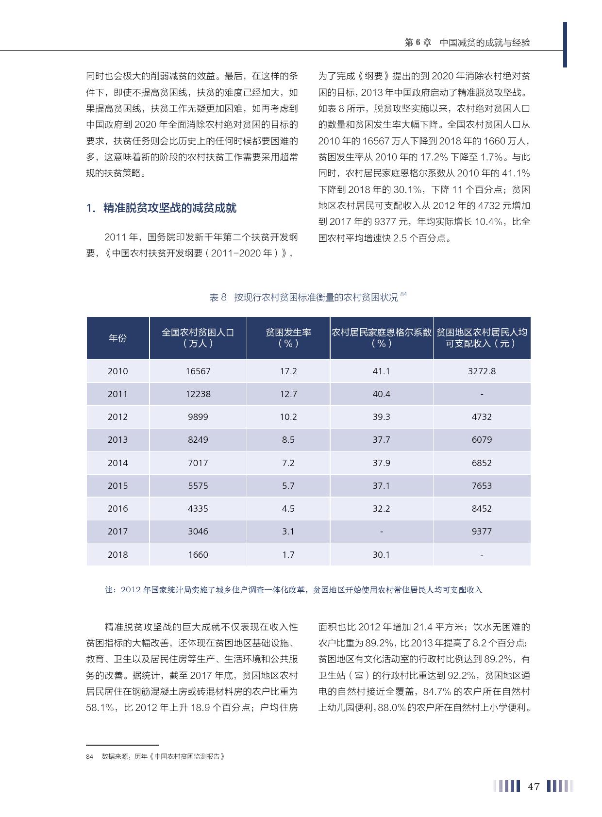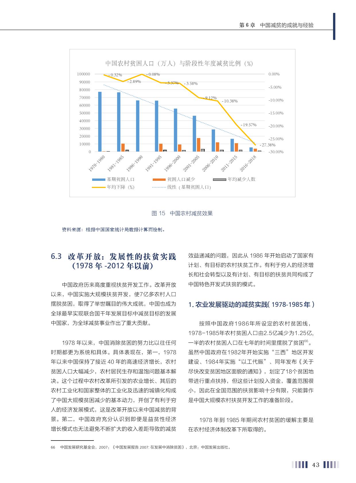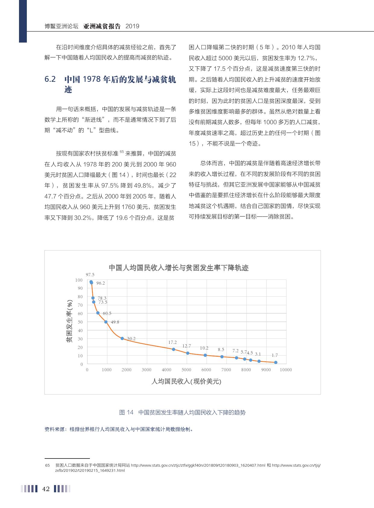 报告称,中国为亚洲减贫提供了“中国方案”。按现有农村扶贫标准来推算,中国的人均收入从1978年的200美元上升到2000年的960美元,贫困发生率从97.5%降到49.8%,减少了47.7个百分点。2000-2005年,随着人均国民收入从960美元上升到1760美元,贫困发生率又下降到30.2%,降低了19.6个百分点。2010年人均国民收入超过5000美元以后,贫困发生率为12.7%,又下降了17.5个百分点。随着人均国民收入的上升,减贫的速度开始放缓。实际上,第三段时间也是减贫难度最大、任务最艰巨的时刻,因为此时的贫困人口是贫困深度最深、受到多维贫困维度影响最多的群体。虽然从绝对数量上看没有前期减贫人数多,但每年1000多万的人口减贫,年度减贫速率之高,超过历史上的任何一个时期。