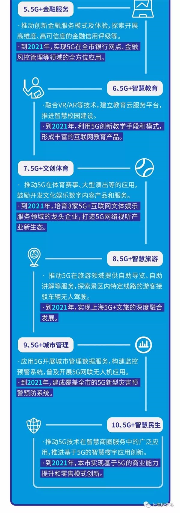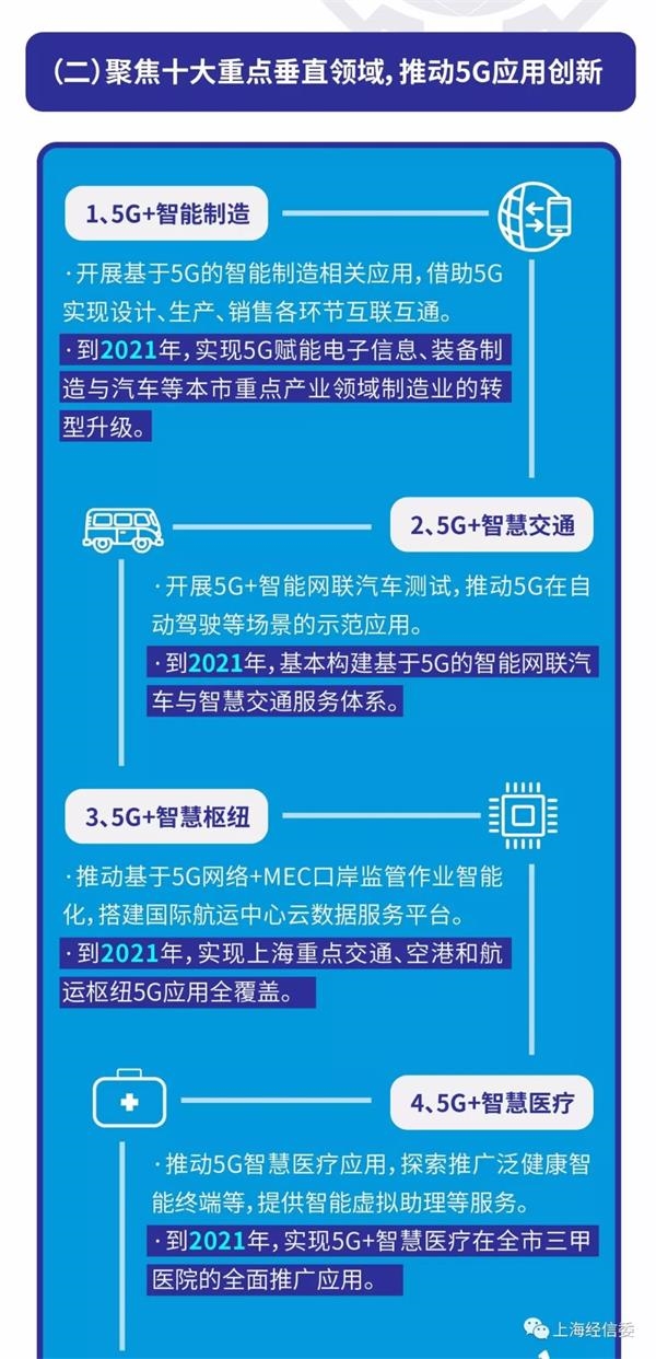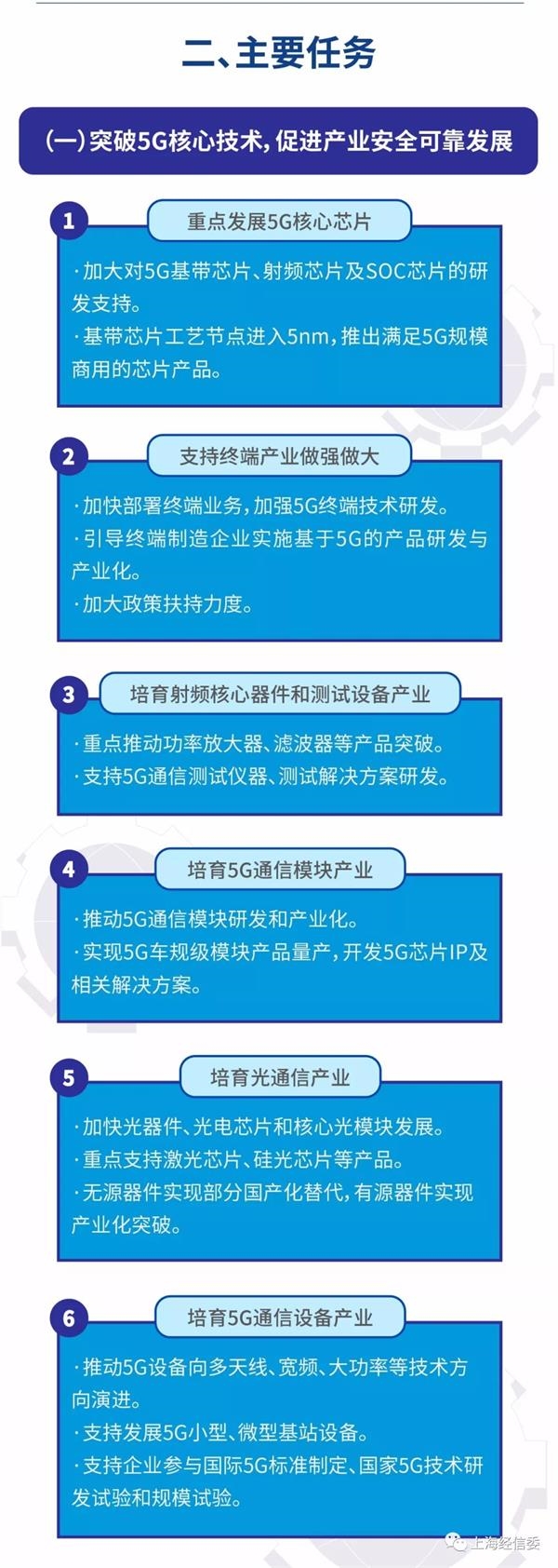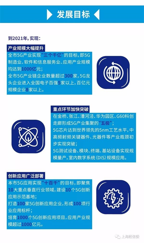 根据行动计划,上海正发挥5G研发集聚、网络先行、场景丰富、人才汇聚等优势,通过突破5G核心技术,促进产业安全可靠发展;聚焦十大重点垂直领域,推动5G应用创新;推动5G与信息产业融合发展,提升产业能级等主要任务,目标到2021年,打造成全球知名的5G产业发展高地和应用创新策源地。其中,产业规模大幅提升。全市5G产业实现“三个千亿”的目标,即5G制造业、软件和信息服务业、应用产业规模均达到1000亿元;重点环节加快突破。5G芯片达到世界领先的5纳米工艺水平,中高频射频关键器件、光器件等产业瓶颈初步实现突破;创新应用广泛部署。5G应用实现“十百千”的目标,即聚焦10大重点垂直行业领域,打造100家5G创新应用企业,培育1000个5G创新应用项目等。