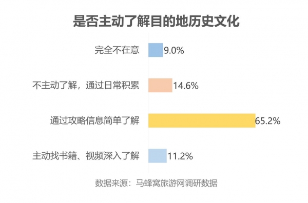 白领对于目的地文化历史的关注也在持续提升。76%的人表示会在出行前主动了解相关历史文化,其中,11%的人甚至会专门搜寻书籍、视频等资料进行深入了解。对于白领人群而言,旅游已经不再是打卡、观光,他们有着更深层次的旅游需求,文化已经成为重要的旅行动因。