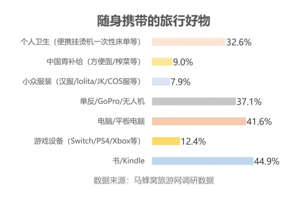 马蜂窝数据研究中心负责人马禹涛指出:“从携带的物品上可以看出,白领人群旅游需求呈现出个性化与多样化的特征。摄影、游戏、阅读等都已成为年轻人旅游的一部分。在旅游这件事上,越来越多人开始拥有自己独特的理解和诉求。”