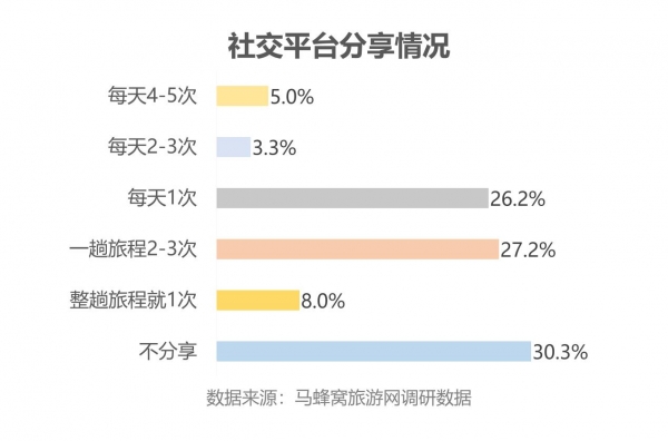相对于其他游客,白领们更愿意在旅途中记录旅行经历。有69.7%的游客愿意在社交平台上分享自己的故事,他们在旅途中平均发布2.8次旅行内容。同时,有34.5%的人表示,他们将每天至少发布一条内容,实时更新旅行动态。